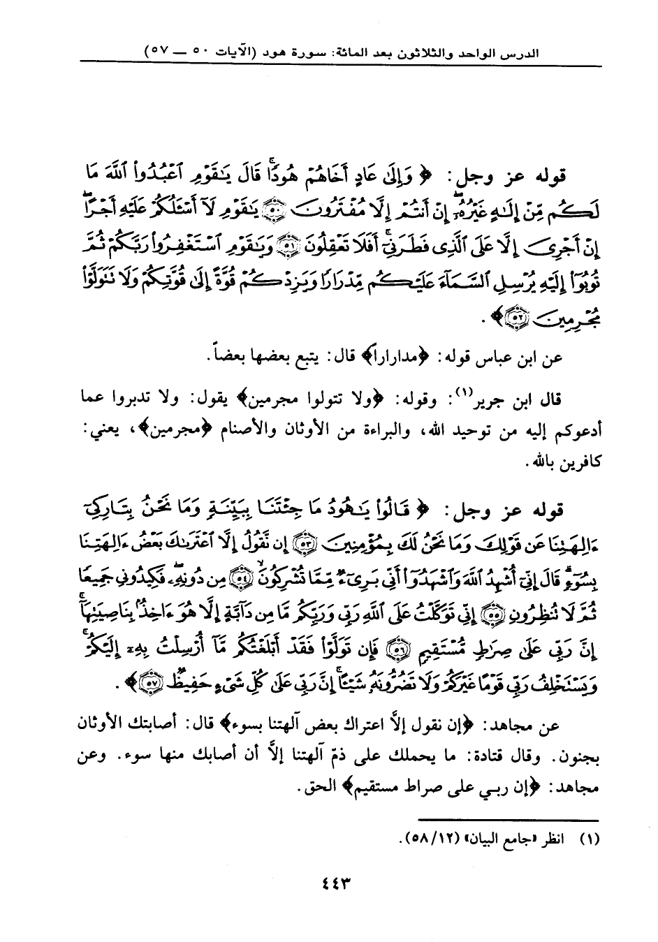 قوله عز وجل: {قَالُواْ يَا هُودُ مَا جِئْتَنَا بِبَيِّنَةٍ وَمَا نَحْنُ بِتَارِكِي آلِهَتِنَا عَن قَوْلِكَ وَمَا نَحْنُ لَكَ بِمُؤْمِنِينَ (53) إِن نَّقُولُ إِلاَّ اعْتَرَاكَ بَعْضُ آلِهَتِنَا بِسُوَءٍ قَالَ إِنِّي أُشْهِدُ اللهِ وَاشْهَدُواْ أَنِّي بَرِيءٌ مِّمَّا تُشْرِكُونَ (54) مِن دُونِهِ فَكِيدُونِي جَمِيعاً ثُمَّ لاَ تُنظِرُونِ (55) إِنِّي تَوَكَّلْتُ عَلَى اللهِ رَبِّي وَرَبِّكُم مَّا مِن دَآبَّةٍ إِلاَّ هُوَ آخِذٌ بِنَاصِيَتِهَا إِنَّ رَبِّي عَلَى صِرَاطٍ مُّسْتَقِيمٍ (56) فَإِن تَوَلَّوْاْ فَقَدْ أَبْلَغْتُكُم مَّا أُرْسِلْتُ بِهِ إِلَيْكُمْ وَيَسْتَخْلِفُ رَبِّي قَوْماً غَيْرَكُمْ وَلاَ تَضُرُّونَهُ شَيْئاً إِنَّ رَبِّي عَلَىَ كُلِّ شَيْءٍ حَفِيظٌ (57) } .