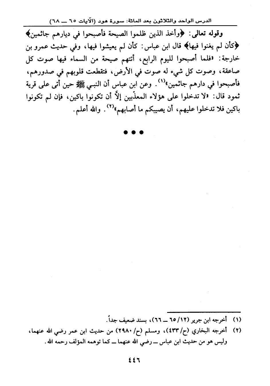 وقوله تعالى: {وَأَخَذَ الَّذِينَ ظَلَمُواْ الصَّيْحَةُ فَأَصْبَحُواْ فِي دِيَارِهِمْ جَاثِمِينَ} {كَأَن لَّمْ يَغْنَوْاْ فِيهَا} ، قال ابن عباس: كأن لم يعيشوا فيها، وفي حديث عمرو بن خارجة: (فلما أصبحوا لليوم الرابع، أتتهم صيحة من السماء فيها صوت كل صاعقة، وصوت كل شيء له صوت في الأرض فتقطعت قلوبهم في صدورهم، فأصحبوا في دارهم جاثمين) , وعن ابن عباس أن النبي - صلى الله عليه وسلم - حين أتى على قرية ثمود قال: «لا تدخلوا على هؤلاء