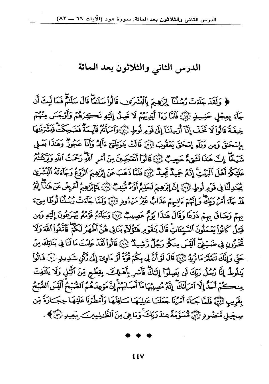{وَلَقَدْ جَاءتْ رُسُلُنَا إِبْرَاهِيمَ بِالْبُشْرَى قَالُواْ سَلاَماً قَالَ سَلاَمٌ فَمَا لَبِثَ أَن جَاء بِعِجْلٍ حَنِيذٍ (69) فَلَمَّا رَأَى أَيْدِيَهُمْ لاَ تَصِلُ إِلَيْهِ نَكِرَهُمْ وَأَوْجَسَ مِنْهُمْ خِيفَةً قَالُواْ لاَ تَخَفْ إِنَّا أُرْسِلْنَا إِلَى قَوْمِ لُوطٍ (70) وَامْرَأَتُهُ قَآئِمَةٌ فَضَحِكَتْ فَبَشَّرْنَاهَا بِإِسْحَاقَ وَمِن وَرَاء إِسْحَاقَ يَعْقُوبَ (71) قَالَتْ يَا وَيْلَتَى أَأَلِدُ وَأَنَاْ عَجُوزٌ وَهَذَا بَعْلِي شَيْخاً إِنَّ هَذَا لَشَيْءٌ عَجِيبٌ (72) قَالُواْ أَتَعْجَبِينَ مِنْ أَمْرِ اللهِ رَحْمَتُ اللهِ وَبَرَكَاتُهُ عَلَيْكُمْ أَهْلَ الْبَيْتِ إِنَّهُ حَمِيدٌ مَّجِيدٌ (73) فَلَمَّا ذَهَبَ عَنْ إِبْرَاهِيمَ الرَّوْعُ وَجَاءتْهُ الْبُشْرَى يُجَادِلُنَا فِي قَوْمِ لُوطٍ (74) إِنَّ إِبْرَاهِيمَ لَحَلِيمٌ أَوَّاهٌ مُّنِيبٌ (75) يَا إِبْرَاهِيمُ أَعْرِضْ عَنْ هَذَا إِنَّهُ قَدْ جَاء أَمْرُ رَبِّكَ وَإِنَّهُمْ آتِيهِمْ عَذَابٌ غَيْرُ مَرْدُودٍ (76) وَلَمَّا جَاءتْ رُسُلُنَا لُوطاً سِيءَ بِهِمْ وَضَاقَ بِهِمْ ذَرْعاً وَقَالَ هَذَا يَوْمٌ عَصِيبٌ (77) وَجَاءهُ قَوْمُهُ يُهْرَعُونَ إِلَيْهِ وَمِن قَبْلُ كَانُواْ يَعْمَلُونَ السَّيِّئَاتِ قَالَ يَا قَوْمِ هَؤُلاء بَنَاتِي هُنَّ أَطْهَرُ لَكُمْ فَاتَّقُواْ اللهَ وَلاَ تُخْزُونِ فِي ضَيْفِي أَلَيْسَ مِنكُمْ رَجُلٌ رَّشِيدٌ (78) قَالُواْ لَقَدْ عَلِمْتَ مَا لَنَا فِي بَنَاتِكَ مِنْ حَقٍّ وَإِنَّكَ لَتَعْلَمُ مَا نُرِيدُ (79) قَالَ لَوْ أَنَّ لِي بِكُمْ قُوَّةً أَوْ آوِي إِلَى رُكْنٍ شَدِيدٍ (80) قَالُواْ يَا لُوطُ إِنَّا رُسُلُ رَبِّكَ لَن يَصِلُواْ إِلَيْكَ فَأَسْرِ بِأَهْلِكَ بِقِطْعٍ مِّنَ اللَّيْلِ وَلاَ يَلْتَفِتْ مِنكُمْ أَحَدٌ إِلاَّ امْرَأَتَكَ إِنَّهُ مُصِيبُهَا مَا أَصَابَهُمْ إِنَّ مَوْعِدَهُمُ الصُّبْحُ أَلَيْسَ الصُّبْحُ بِقَرِيبٍ (81) فَلَمَّا جَاء أَمْرُنَا جَعَلْنَا عَالِيَهَا