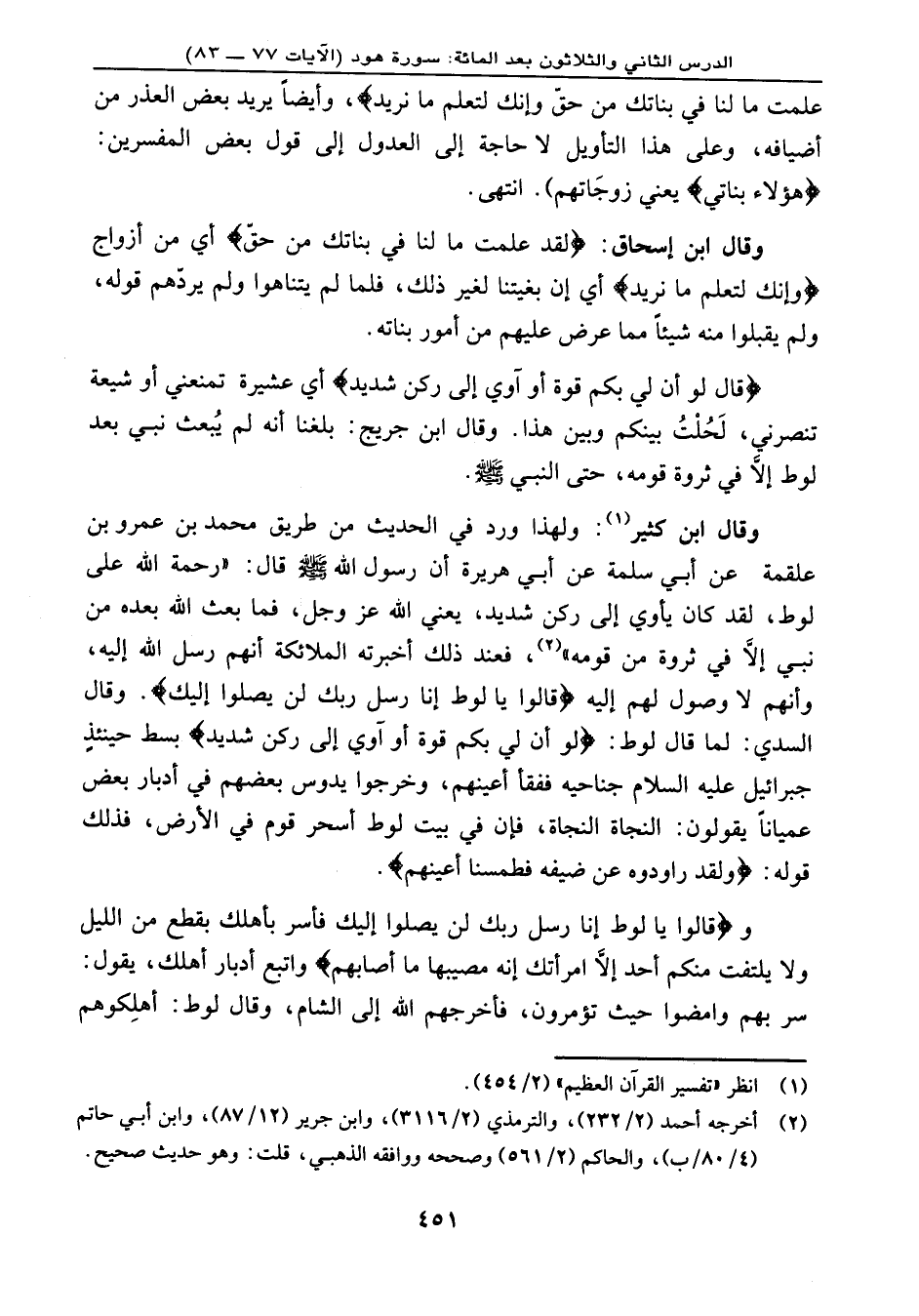 وقال ابن كثير: ولهذا ورد في الحديث من طريق محمد بن عمرو بن علقمة عن أبي سلمة عن أبي هريرة أن رسول الله - صلى الله عليه وسلم - قال: «رحمة الله على لوط، لقد كان يأوي إلى ركن شديد، يعني: الله عز وجل، فما بعث الله بعده من نبي إلا في ثروة من قومه» . فعند ذلك أخبرته الملائكة أنهم رسل الله إليه، وأنهم لا وصول لهم إليه {قَالُواْ يَا لُوطُ إِنَّا رُسُلُ رَبِّكَ لَن يَصِلُواْ إِلَيْكَ} . وقال السدي: لما قال لوط: {لَوْ أَنَّ لِي بِكُمْ قُوَّةً أَوْ آوِي إِلَى رُكْنٍ شَدِيدٍ} بسط حينئذٍ جبرائيل عليه السلام جناحيه ففقأ أعينهم، وخرجوا يدوس بعضهم في أدبار بعض عميانًا يقولون: النجاة النجاة، فإن