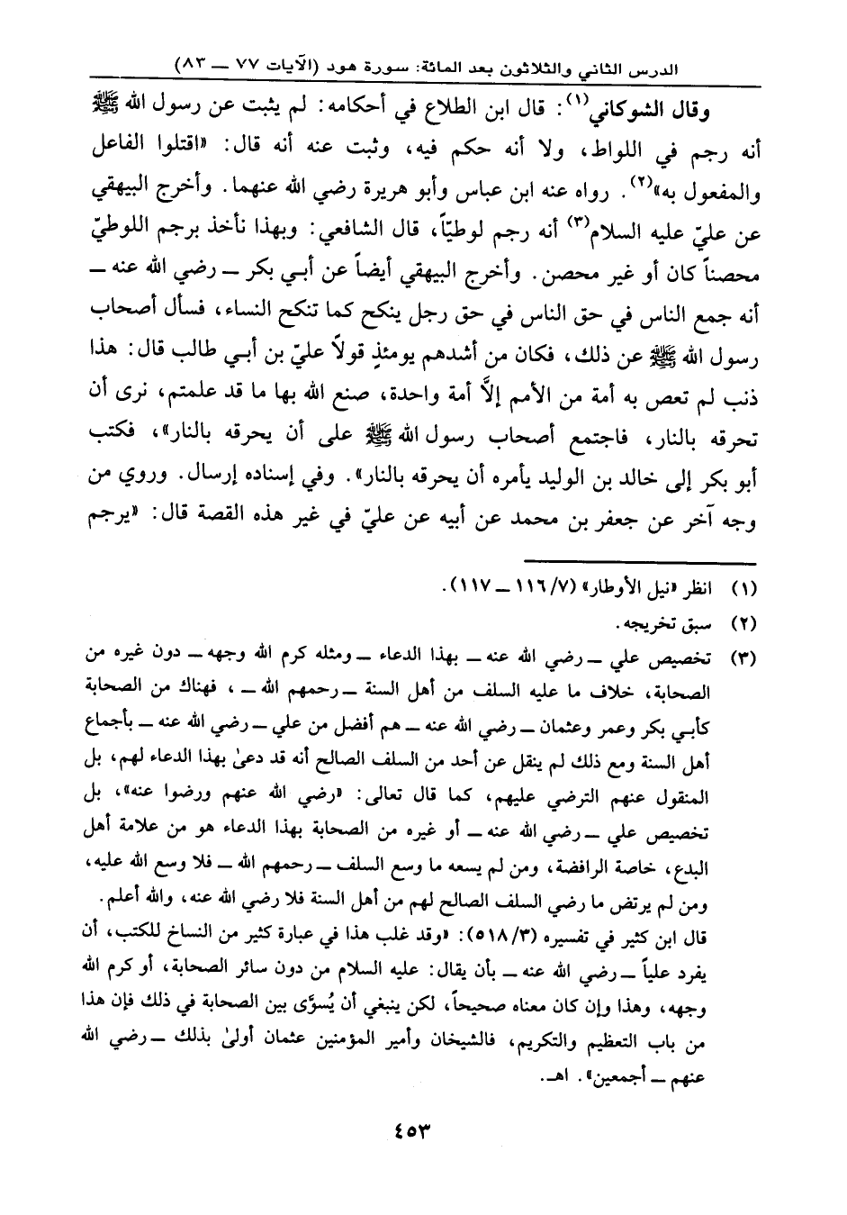 وقال الشوكاني: قال ابن الطلاع في أحكامه: لم يثبت عن رسول الله - صلى الله عليه وسلم - أنه رجم في اللواط، ولا أنه حكم فيه، وثبت عنه أنه قال: «اقتلوا الفاعل والمفعول به» . رواه عنه ابن عباس، وأبو هريرة رضي الله عنهما. وأخرج البيهقي عن عليّ عليه السلام أنه رجم لوطيًّا. قال الشافعي: وبهذا نأخذ برجم اللوطيّ محصنًا كان أو غير محصن. وأخرج البيهقي أيضًا عن أبي بكر - رضي الله عنه -: أنه جمع الناس في حق الناس في حق رجل ينكح كما تنكح النساء، فسأل أصحاب رسول الله - صلى الله عليه وسلم - عن ذلك، فكان من أشدهم يومئذٍ قولاً عليّ بن أبي طالب قال: هذا ذنب لم تعص به أمة من الأمم إلا أمة واحدة، صنع الله بها ما قد علمتم، نرى أن تحرقه بالنار، فاجتمع أصحاب رسول الله - صلى الله عليه وسلم - على أن يحرقه بالنار، فكتب أبو بكر إلى خالد بن الوليد يأمره أن يحرقه بالنار. وفي إسناده إرسال. وروي من وجه آخر عن جعفر بن محمد عن أبيه عن عليّ في غير هذه القصة قال: (يرجم