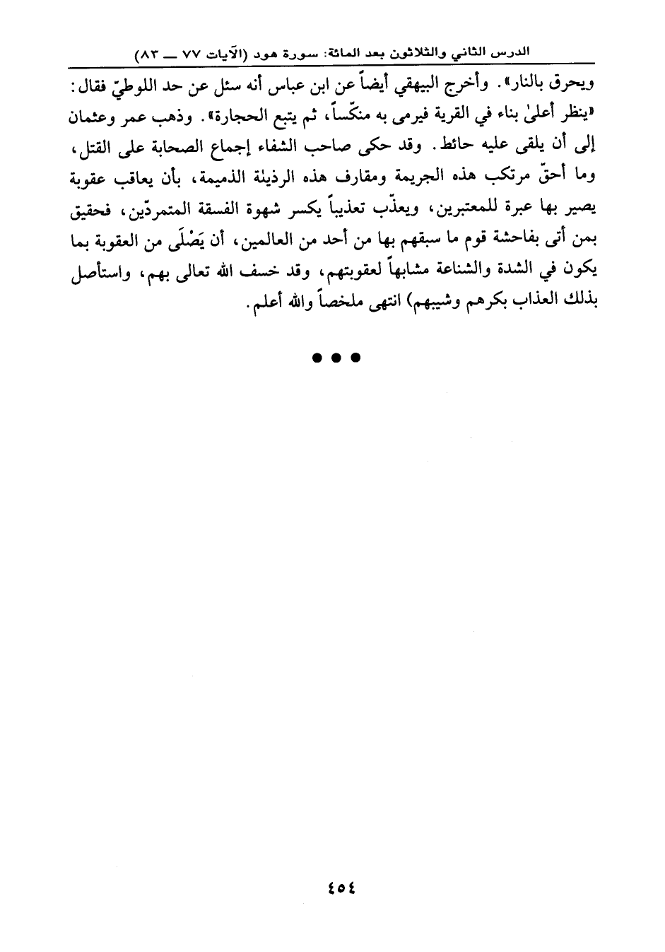ويحرق بالنار) . وأخرج البيهقي أيضًا عن ابن عباس أنه سئل عن حد اللوطيّ فقال: (ينظر أعلى بناء في القرية فيرمى به منكّسًا، ثم يتبع الحجارة) . وذهب عمر، وعثمان إلى أنه يلقى عليه حائط. وقد حكى صاحب الشفاء إجماع الصحابة على القتل، وما أحقّ مرتكب هذه الجريمة ومقارف هذه الرذيلة الذميمة، بأن يعاقب عقوبة يصير بها عبرة للمعتبرين، ويعذّب تعذيًا يكسر شهوة الفسقة المتمردّين، فحقيق بمن أتى بفاحشة قوم ما سبقهم بها من أحد من العالمين، أن يَصْلَى من العقوبة بما يكون في الشدة والشناعة مشابهًا لعقوبتهم، وقد خسف الله تعالى بهم، واستأصل بذلك العذاب بكرهم وشيبهم) انتهى ملخصًا. والله أعلم.