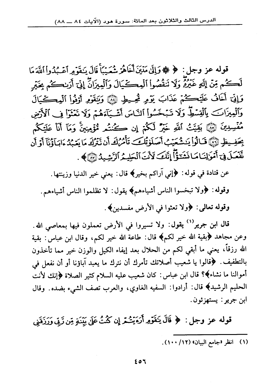 قوله عز وجل: {وَإِلَى مَدْيَنَ أَخَاهُمْ شُعَيْباً قَالَ يَا قَوْمِ اعْبُدُواْ اللهَ مَا لَكُم مِّنْ إِلَهٍ غَيْرُهُ وَلاَ تَنقُصُواْ الْمِكْيَالَ وَالْمِيزَانَ إِنِّيَ أَرَاكُم بِخَيْرٍ وَإِنِّيَ أَخَافُ عَلَيْكُمْ عَذَابَ يَوْمٍ مُّحِيطٍ (84) وَيَا قَوْمِ أَوْفُواْ الْمِكْيَالَ وَالْمِيزَانَ بِالْقِسْطِ وَلاَ تَبْخَسُواْ النَّاسَ أَشْيَاءهُمْ وَلاَ تَعْثَوْاْ فِي الأَرْضِ مُفْسِدِينَ (85) بَقِيَّةُ اللهِ خَيْرٌ لَّكُمْ إِن كُنتُم مُّؤْمِنِينَ وَمَا أَنَاْ عَلَيْكُم بِحَفِيظٍ (86) قَالُواْ يَا شُعَيْبُ أَصَلاَتُكَ تَأْمُرُكَ أَن نَّتْرُكَ مَا يَعْبُدُ آبَاؤُنَا أَوْ أَن نَّفْعَلَ فِي أَمْوَالِنَا مَا نَشَاء إِنَّكَ لَأَنتَ الْحَلِيمُ الرَّشِيدُ (87) } .