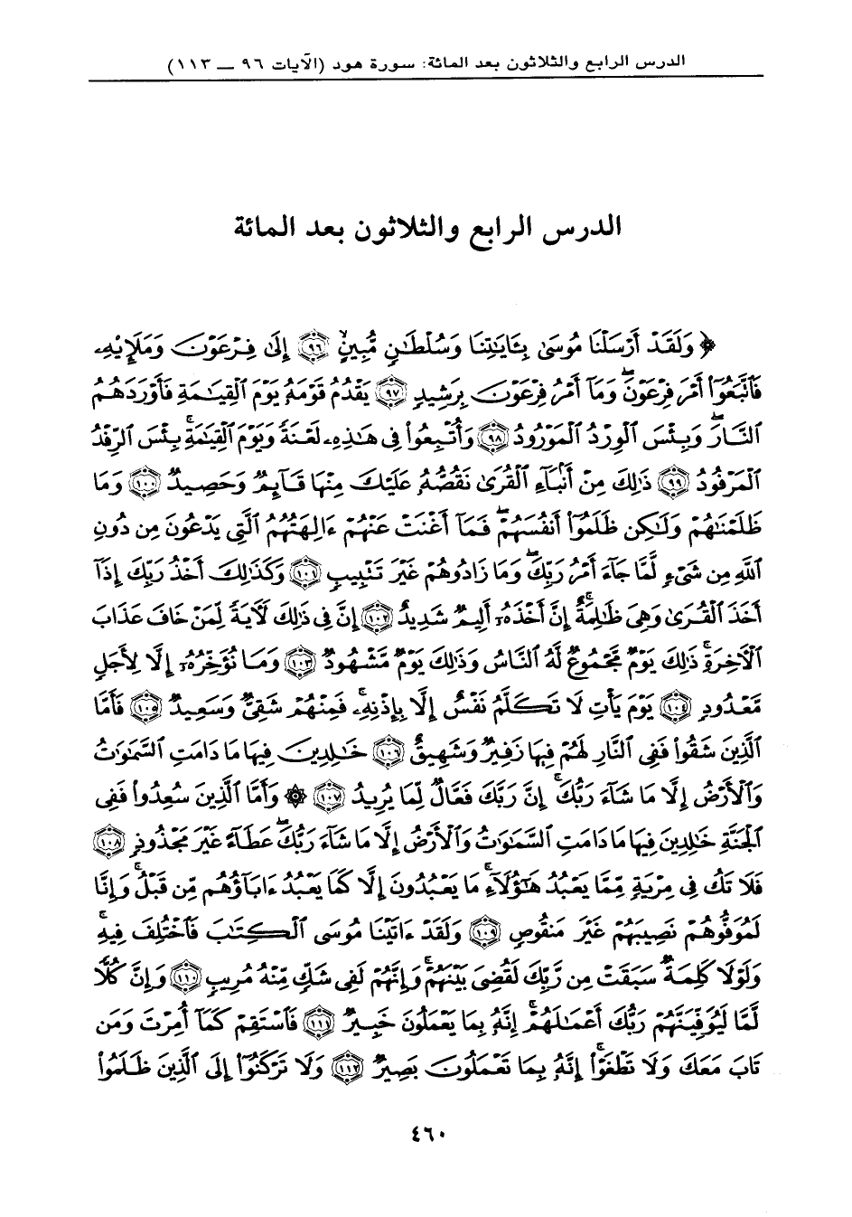 {وَلَقَدْ أَرْسَلْنَا مُوسَى بِآيَاتِنَا وَسُلْطَانٍ مُّبِينٍ (96) إِلَى فِرْعَوْنَ وَمَلَئِهِ فَاتَّبَعُواْ أَمْرَ فِرْعَوْنَ وَمَا أَمْرُ فِرْعَوْنَ بِرَشِيدٍ (97) يَقْدُمُ قَوْمَهُ يَوْمَ الْقِيَامَةِ فَأَوْرَدَهُمُ النَّارَ وَبِئْسَ الْوِرْدُ الْمَوْرُودُ (98) وَأُتْبِعُواْ فِي هَذِهِ لَعْنَةً وَيَوْمَ الْقِيَامَةِ بِئْسَ الرِّفْدُ الْمَرْفُودُ (99) ذَلِكَ مِنْ أَنبَاء الْقُرَى نَقُصُّهُ عَلَيْكَ مِنْهَا قَآئِمٌ وَحَصِيدٌ (100) وَمَا ظَلَمْنَاهُمْ وَلَكِن ظَلَمُواْ أَنفُسَهُمْ فَمَا أَغْنَتْ عَنْهُمْ آلِهَتُهُمُ الَّتِي يَدْعُونَ مِن دُونِ اللهِ مِن شَيْءٍ لِّمَّا جَاء أَمْرُ رَبِّكَ وَمَا زَادُوهُمْ غَيْرَ تَتْبِيبٍ (101) وَكَذَلِكَ أَخْذُ رَبِّكَ إِذَا أَخَذَ الْقُرَى وَهِيَ ظَالِمَةٌ إِنَّ أَخْذَهُ أَلِيمٌ شَدِيدٌ (102) إِنَّ فِي ذَلِكَ لآيَةً لِّمَنْ خَافَ عَذَابَ الآخِرَةِ ذَلِكَ يَوْمٌ مَّجْمُوعٌ لَّهُ النَّاسُ وَذَلِكَ يَوْمٌ مَّشْهُودٌ (103) وَمَا نُؤَخِّرُهُ إِلاَّ لِأَجَلٍ مَّعْدُودٍ (104) يَوْمَ يَأْتِ لاَ تَكَلَّمُ نَفْسٌ إِلاَّ بِإِذْنِهِ فَمِنْهُمْ شَقِيٌّ وَسَعِيدٌ (105) فَأَمَّا الَّذِينَ شَقُواْ فَفِي النَّارِ لَهُمْ فِيهَا زَفِيرٌ وَشَهِيقٌ (106) خَالِدِينَ فِيهَا مَا دَامَتِ السَّمَاوَاتُ وَالأَرْضُ إِلاَّ مَا شَاء رَبُّكَ إِنَّ رَبَّكَ فَعَّالٌ لِّمَا يُرِيدُ (107) وَأَمَّا الَّذِينَ سُعِدُواْ فَفِي الْجَنَّةِ خَالِدِينَ فِيهَا مَا دَامَتِ السَّمَاوَاتُ وَالأَرْضُ إِلاَّ مَا شَاء رَبُّكَ عَطَاء غَيْرَ مَجْذُوذٍ (108) فَلاَ تَكُ فِي مِرْيَةٍ مِّمَّا يَعْبُدُ هَؤُلاء مَا يَعْبُدُونَ إِلاَّ كَمَا يَعْبُدُ آبَاؤُهُم مِّن قَبْلُ وَإِنَّا لَمُوَفُّوهُمْ نَصِيبَهُمْ غَيْرَ مَنقُوصٍ (109) وَلَقَدْ آتَيْنَا مُوسَى الْكِتَابَ فَاخْتُلِفَ فِيهِ وَلَوْلاَ كَلِمَةٌ سَبَقَتْ مِن رَّبِّكَ لَقُضِيَ بَيْنَهُمْ وَإِنَّهُمْ لَفِي شَكٍّ مِّنْهُ مُرِيبٍ (110)