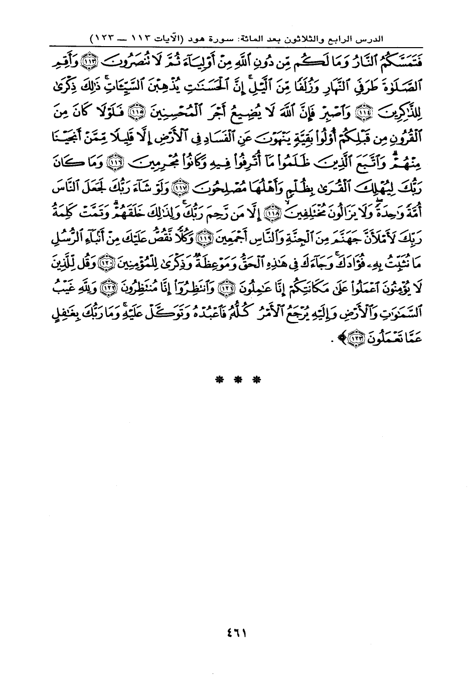 فَتَمَسَّكُمُ النَّارُ وَمَا لَكُم مِّن دُونِ اللهِ مِنْ أَوْلِيَاء ثُمَّ لاَ تُنصَرُونَ (113) وَأَقِمِ الصَّلاَةَ طَرَفَيِ النَّهَارِ وَزُلَفاً مِّنَ اللَّيْلِ إِنَّ الْحَسَنَاتِ يُذْهِبْنَ السَّيِّئَاتِ ذَلِكَ ذِكْرَى لِلذَّاكِرِينَ (114) وَاصْبِرْ فَإِنَّ اللهَ لاَ يُضِيعُ أَجْرَ الْمُحْسِنِينَ (115) فَلَوْلاَ كَانَ مِنَ الْقُرُونِ مِن قَبْلِكُمْ أُوْلُواْ بَقِيَّةٍ يَنْهَوْنَ عَنِ الْفَسَادِ فِي الأَرْضِ إِلاَّ قَلِيلاً مِّمَّنْ أَنجَيْنَا مِنْهُمْ وَاتَّبَعَ الَّذِينَ ظَلَمُواْ مَا أُتْرِفُواْ فِيهِ وَكَانُواْ مُجْرِمِينَ (116) وَمَا كَانَ رَبُّكَ لِيُهْلِكَ الْقُرَى بِظُلْمٍ وَأَهْلُهَا مُصْلِحُونَ (117) وَلَوْ شَاء رَبُّكَ لَجَعَلَ النَّاسَ أُمَّةً وَاحِدَةً وَلاَ يَزَالُونَ مُخْتَلِفِينَ (118) إِلاَّ مَن رَّحِمَ رَبُّكَ وَلِذَلِكَ خَلَقَهُمْ وَتَمَّتْ كَلِمَةُ رَبِّكَ لأَمْلأنَّ جَهَنَّمَ مِنَ الْجِنَّةِ وَالنَّاسِ أَجْمَعِينَ (119) وَكُلاًّ نَّقُصُّ عَلَيْكَ مِنْ أَنبَاء الرُّسُلِ مَا نُثَبِّتُ بِهِ فُؤَادَكَ وَجَاءكَ فِي هَذِهِ الْحَقُّ وَمَوْعِظَةٌ وَذِكْرَى لِلْمُؤْمِنِينَ (120) وَقُل لِّلَّذِينَ لاَ يُؤْمِنُونَ اعْمَلُواْ عَلَى مَكَانَتِكُمْ إِنَّا عَامِلُونَ (121) وَانتَظِرُوا إِنَّا مُنتَظِرُونَ (122) وَلِلّهِ غَيْبُ السَّمَاوَاتِ وَالأَرْضِ وَإِلَيْهِ يُرْجَعُ الأَمْرُ كُلُّهُ فَاعْبُدْهُ وَتَوَكَّلْ عَلَيْهِ وَمَا رَبُّكَ بِغَافِلٍ عَمَّا تَعْمَلُونَ (123) } .