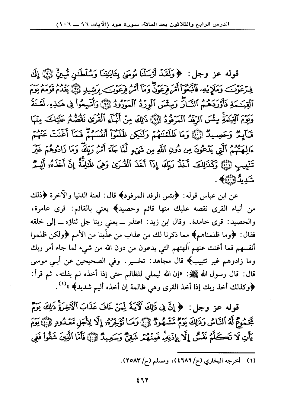 قوله عز وجل: {إِنَّ فِي ذَلِكَ لآيَةً لِّمَنْ خَافَ عَذَابَ الآخِرَةِ ذَلِكَ يَوْمٌ مَّجْمُوعٌ لَّهُ النَّاسُ وَذَلِكَ يَوْمٌ مَّشْهُودٌ (103) وَمَا نُؤَخِّرُهُ إِلاَّ لِأَجَلٍ مَّعْدُودٍ (104) يَوْمَ يَأْتِ لاَ تَكَلَّمُ نَفْسٌ إِلاَّ بِإِذْنِهِ فَمِنْهُمْ شَقِيٌّ وَسَعِيدٌ (105) فَأَمَّا الَّذِينَ شَقُواْ فَفِي