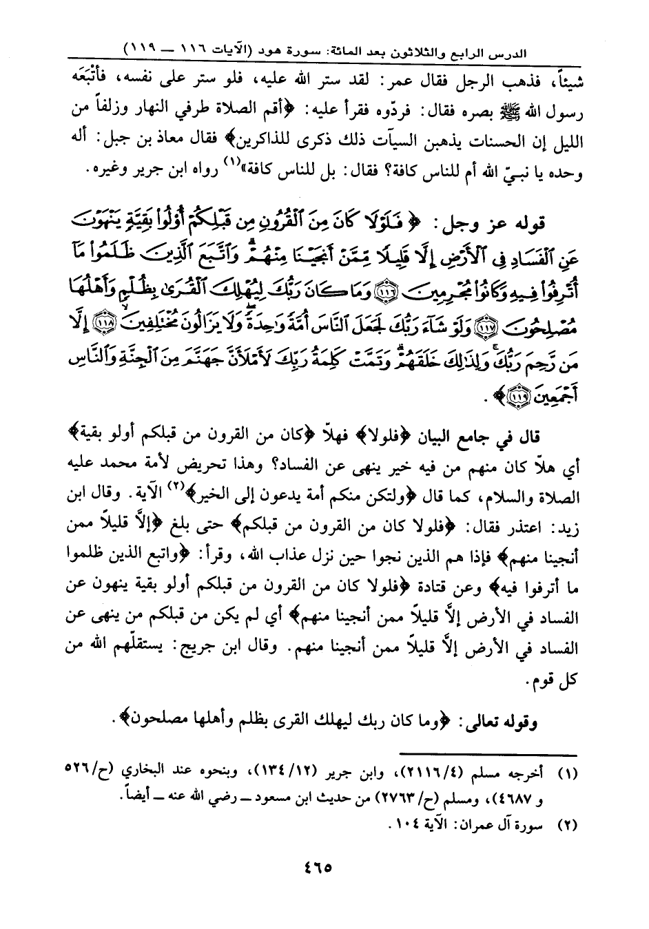 قال في جامع البيان: {فَلَوْلاَ} فهلا {كَانَ مِنَ الْقُرُونِ مِن قَبْلِكُمْ أُوْلُواْ بَقِيَّةٍ} ، أي: هلا كان منهم من فيه خير ينهى عن الفساد؟ وهذا تحريض لأمة محمد عليه الصلاة والسلام، كما قال: {وَلْتَكُن مِّنكُمْ أُمَّةٌ يَدْعُونَ إِلَى الْخَيْرِ} الآية. وقال ابن زيد: اعتذر فقال: {فَلَوْلاَ كَانَ مِنَ الْقُرُونِ مِن قَبْلِكُمْ} حتى بلغ: {إِلاَّ قَلِيلاً مِّمَّنْ أَنجَيْنَا مِنْهُمْ} فإذا هم الذين نجوا حين نزل عذاب الله وقرأ: {وَاتَّبَعَ الَّذِينَ ظَلَمُواْ مَا أُتْرِفُواْ فِيهِ} . وعن قتادة: {فَلَوْلاَ كَانَ مِنَ الْقُرُونِ مِن قَبْلِكُمْ أُوْلُواْ بَقِيَّةٍ يَنْهَوْنَ عَنِ الْفَسَادِ فِي الأَرْضِ إِلاَّ قَلِيلاً مِّمَّنْ أَنجَيْنَا مِنْهُمْ} ، أي: لم يكن من قبلكم من ينه عن الفساد في الأرض إلا قليلاً ممن أنجينا منهم. وقال ابن جريج: يستقلّهم الله من كل قوم.