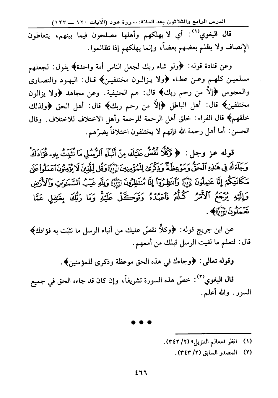 قوله عز وجل: {وَكُلاًّ نَّقُصُّ عَلَيْكَ مِنْ أَنبَاء الرُّسُلِ مَا نُثَبِّتُ بِهِ فُؤَادَكَ وَجَاءكَ فِي هَذِهِ الْحَقُّ وَمَوْعِظَةٌ وَذِكْرَى لِلْمُؤْمِنِينَ (120) وَقُل لِّلَّذِينَ لاَ يُؤْمِنُونَ اعْمَلُواْ عَلَى مَكَانَتِكُمْ إِنَّا عَامِلُونَ (121) وَانتَظِرُوا إِنَّا مُنتَظِرُونَ (122) وَلِلّهِ غَيْبُ السَّمَاوَاتِ وَالأَرْضِ وَإِلَيْهِ يُرْجَعُ الأَمْرُ كُلُّهُ فَاعْبُدْهُ وَتَوَكَّلْ عَلَيْهِ وَمَا رَبُّكَ بِغَافِلٍ عَمَّا تَعْمَلُونَ (123) } .