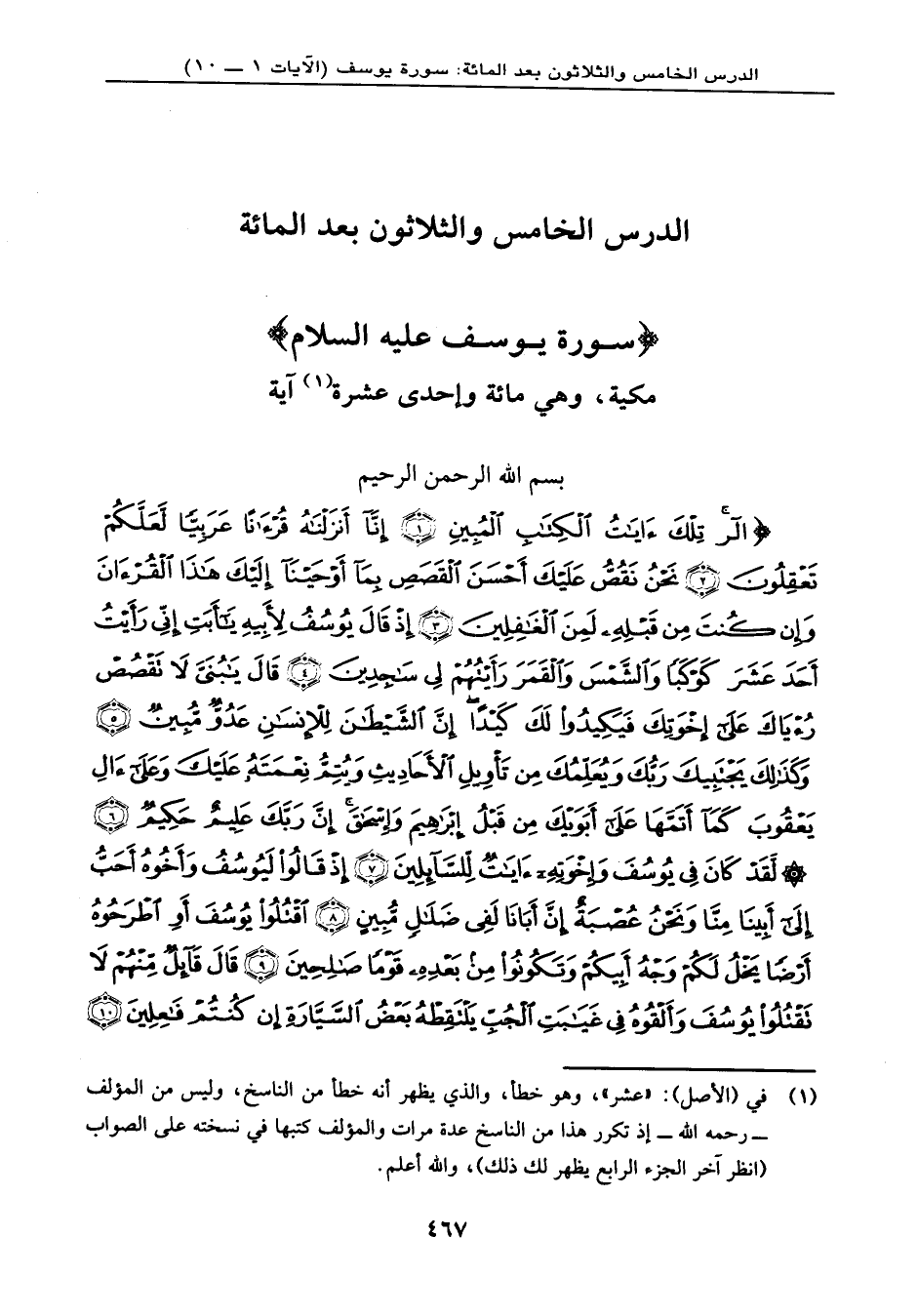 {آلر تِلْكَ آيَاتُ الْكِتَابِ الْمُبِينِ (1) إِنَّا أَنزَلْنَاهُ قُرْآناً عَرَبِيّاً لَّعَلَّكُمْ تَعْقِلُونَ (2) نَحْنُ نَقُصُّ عَلَيْكَ أَحْسَنَ الْقَصَصِ بِمَا أَوْحَيْنَا إِلَيْكَ هَذَا الْقُرْآنَ وَإِن كُنتَ مِن قَبْلِهِ لَمِنَ الْغَافِلِينَ (3) إِذْ قَالَ يُوسُفُ لِأَبِيهِ يَا أَبتِ إِنِّي رَأَيْتُ أَحَدَ عَشَرَ كَوْكَباً وَالشَّمْسَ وَالْقَمَرَ رَأَيْتُهُمْ لِي سَاجِدِينَ (4) قَالَ يَا بُنَيَّ لاَ تَقْصُصْ رُؤْيَاكَ عَلَى إِخْوَتِكَ فَيَكِيدُواْ لَكَ كَيْداً إِنَّ الشَّيْطَانَ لِلإِنسَانِ عَدُوٌّ مُّبِينٌ (5) وَكَذَلِكَ يَجْتَبِيكَ رَبُّكَ وَيُعَلِّمُكَ مِن تَأْوِيلِ الأَحَادِيثِ وَيُتِمُّ نِعْمَتَهُ عَلَيْكَ وَعَلَى آلِ يَعْقُوبَ كَمَا أَتَمَّهَا عَلَى أَبَوَيْكَ مِن قَبْلُ إِبْرَاهِيمَ وَإِسْحَاقَ إِنَّ رَبَّكَ عَلِيمٌ حَكِيمٌ (6) لَّقَدْ كَانَ فِي يُوسُفَ وَإِخْوَتِهِ آيَاتٌ لِّلسَّائِلِينَ (7) إِذْ قَالُواْ لَيُوسُفُ وَأَخُوهُ أَحَبُّ إِلَى أَبِينَا مِنَّا وَنَحْنُ عُصْبَةٌ إِنَّ أَبَانَا لَفِي ضَلاَلٍ مُّبِينٍ (8) اقْتُلُواْ يُوسُفَ أَوِ اطْرَحُوهُ أَرْضاً يَخْلُ لَكُمْ وَجْهُ أَبِيكُمْ وَتَكُونُواْ مِن بَعْدِهِ قَوْماً صَالِحِينَ (9) قَالَ قَآئِلٌ مَّنْهُمْ لاَ تَقْتُلُواْ يُوسُفَ وَأَلْقُوهُ فِي غَيَابَةِ الْجُبِّ يَلْتَقِطْهُ بَعْضُ السَّيَّارَةِ إِن كُنتُمْ فَاعِلِينَ (10)