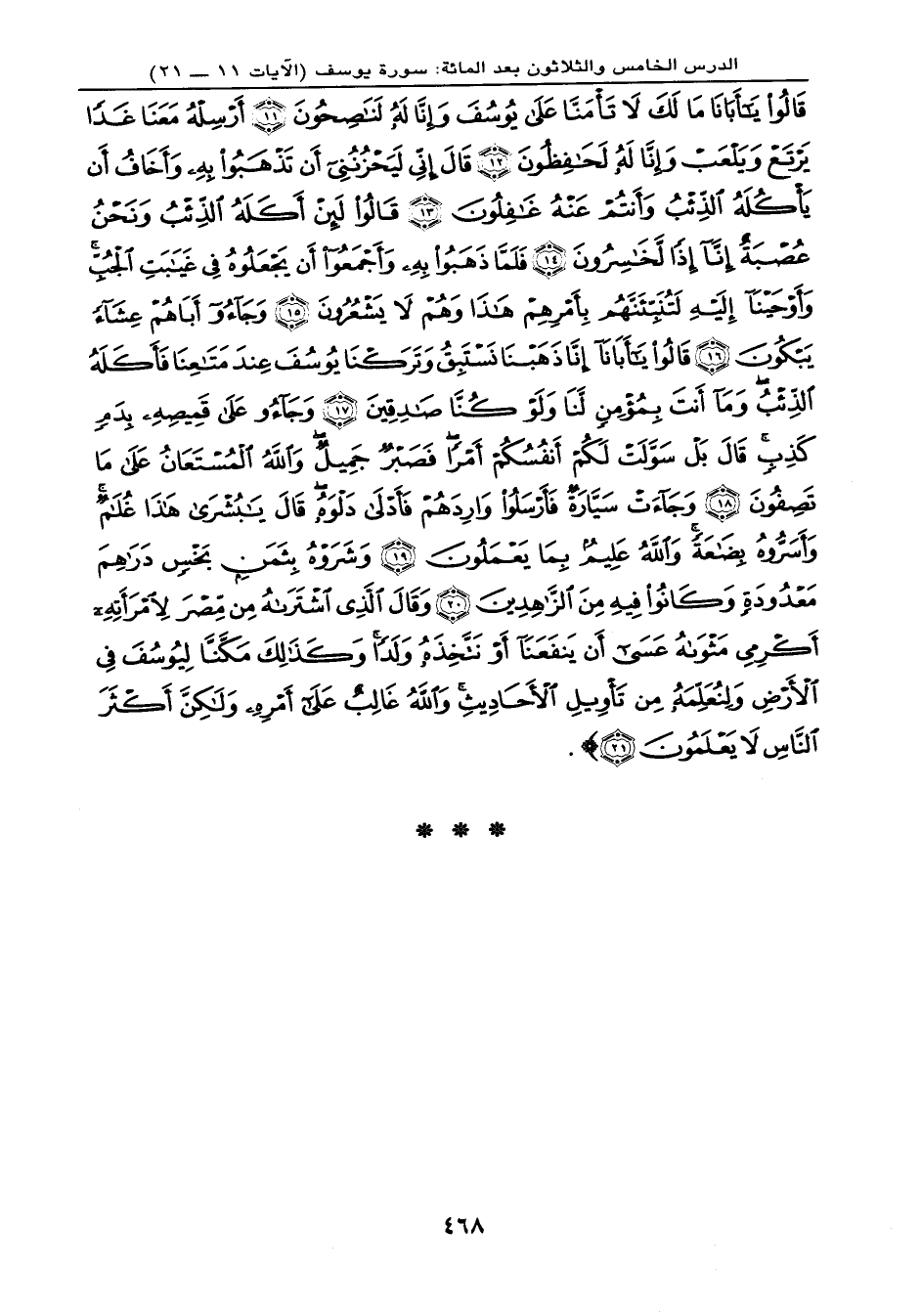 لَيَحْزُنُنِي أَن تَذْهَبُواْ بِهِ وَأَخَافُ أَن يَأْكُلَهُ الذِّئْبُ وَأَنتُمْ عَنْهُ غَافِلُونَ (13) قَالُواْ لَئِنْ أَكَلَهُ الذِّئْبُ وَنَحْنُ عُصْبَةٌ إِنَّا إِذاً لَّخَاسِرُونَ (14) فَلَمَّا ذَهَبُواْ بِهِ وَأَجْمَعُواْ أَن يَجْعَلُوهُ فِي غَيَابَةِ الْجُبِّ وَأَوْحَيْنَا إِلَيْهِ لَتُنَبِّئَنَّهُم بِأَمْرِهِمْ هَذَا وَهُمْ لاَ يَشْعُرُونَ (15) وَجَاؤُواْ أَبَاهُمْ عِشَاء يَبْكُونَ (16) قَالُواْ يَا أَبَانَا إِنَّا ذَهَبْنَا نَسْتَبِقُ وَتَرَكْنَا يُوسُفَ عِندَ مَتَاعِنَا فَأَكَلَهُ الذِّئْبُ وَمَا أَنتَ بِمُؤْمِنٍ لِّنَا وَلَوْ كُنَّا صَادِقِينَ (17) وَجَآؤُوا عَلَى قَمِيصِهِ بِدَمٍ كَذِبٍ قَالَ بَلْ سَوَّلَتْ لَكُمْ أَنفُسُكُمْ أَمْراً فَصَبْرٌ جَمِيلٌ وَاللهُ الْمُسْتَعَانُ عَلَى مَا تَصِفُونَ (18) وَجَاءتْ سَيَّارَةٌ فَأَرْسَلُواْ وَارِدَهُمْ فَأَدْلَى دَلْوَهُ قَالَ يَا بُشْرَى هَذَا غُلاَمٌ وَأَسَرُّوهُ بِضَاعَةً وَاللهُ عَلِيمٌ بِمَا يَعْمَلُونَ (19) وَشَرَوْهُ بِثَمَنٍ بَخْسٍ دَرَاهِمَ مَعْدُودَةٍ وَكَانُواْ فِيهِ مِنَ الزَّاهِدِينَ (20) وَقَالَ الَّذِي اشْتَرَاهُ مِن مِّصْرَ لاِمْرَأَتِهِ أَكْرِمِي مَثْوَاهُ عَسَى أَن يَنفَعَنَا أَوْ نَتَّخِذَهُ وَلَداً وَكَذَلِكَ مَكَّنِّا لِيُوسُفَ فِي الأَرْضِ وَلِنُعَلِّمَهُ مِن تَأْوِيلِ الأَحَادِيثِ وَاللهُ غَالِبٌ عَلَى أَمْرِهِ وَلَكِنَّ أَكْثَرَ النَّاسِ لاَ يَعْلَمُونَ (21) } .