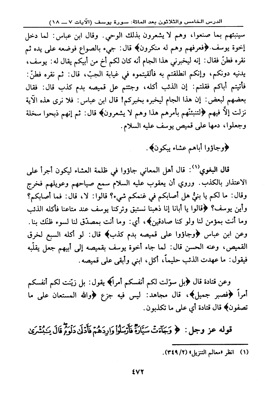 قال البغوي: قال أهل المعاني: جاؤوا في ظلمة العشاء ليكون أجرأ على الاعتذار بالكذب. وروي أن يعقوب عليه السلام سمع صياحهم وعويلهم فخرج وقال: ما لكم يا بنيُّ هل أصابكم في غنمكم شيء؟ قالوا: لا. قال: فما أصابكم؟ وأين يوسف؟ {قَالُوا يَا أَبَانَا إِنَّا ذَهَبْنَا نَسْتَبِقُ وَتَرَكْنَا يُوسُفَ عِنْدَ مَتَاعِنَا فَأَكَلَهُ الذِّئْبُ وَمَا أَنْتَ بِمُؤْمِنٍ لَنَا وَلَوْ كُنَّا صَادِقِينَ} ، أي: وما أنت بمصدّق لنا لسوء ظنّك بنا. وعن ابن عباس: {وَجَآؤُوا عَلَى قَمِيصِهِ بِدَمٍ كَذِبٍ} ، قال: لو أكله السبع لخرق القميص. وعنه الحسن قال: لما جاء أخوة يوسف بقميصه إلى أبيهم جعل يقلّبه فيقول: ما عهدت الذئب حليمًا، أكل ابني وأبقى على قميصه.