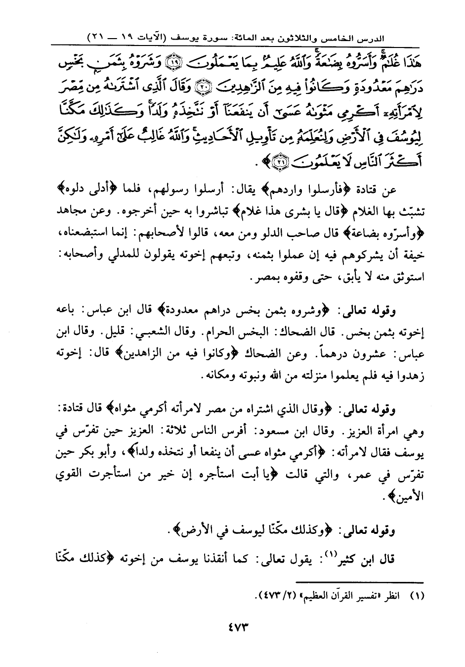 هَذَا غُلاَمٌ وَأَسَرُّوهُ بِضَاعَةً وَاللهُ عَلِيمٌ بِمَا يَعْمَلُونَ (19) وَشَرَوْهُ بِثَمَنٍ بَخْسٍ دَرَاهِمَ مَعْدُودَةٍ وَكَانُواْ فِيهِ مِنَ الزَّاهِدِينَ (20) وَقَالَ الَّذِي اشْتَرَاهُ مِن مِّصْرَ لاِمْرَأَتِهِ أَكْرِمِي مَثْوَاهُ عَسَى أَن يَنفَعَنَا أَوْ نَتَّخِذَهُ وَلَداً
