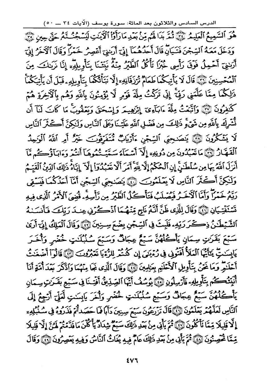 هُوَ السَّمِيعُ الْعَلِيمُ (34) ثُمَّ بَدَا لَهُم مِّن بَعْدِ مَا رَأَوُاْ الآيَاتِ لَيَسْجُنُنَّهُ حَتَّى حِينٍ (35) وَدَخَلَ مَعَهُ السِّجْنَ فَتَيَانَ قَالَ أَحَدُهُمَا إِنِّي أَرَانِي أَعْصِرُ خَمْراً وَقَالَ الآخَرُ إِنِّي أَرَانِي أَحْمِلُ فَوْقَ رَأْسِي خُبْزاً تَأْكُلُ الطَّيْرُ مِنْهُ نَبِّئْنَا بِتَأْوِيلِهِ إِنَّا نَرَاكَ مِنَ الْمُحْسِنِينَ (36) قَالَ لاَ يَأْتِيكُمَا طَعَامٌ تُرْزَقَانِهِ إِلاَّ نَبَّأْتُكُمَا بِتَأْوِيلِهِ قَبْلَ أَن يَأْتِيكُمَا ذَلِكُمَا مِمَّا عَلَّمَنِي رَبِّي إِنِّي تَرَكْتُ مِلَّةَ قَوْمٍ لاَّ يُؤْمِنُونَ بِاللهِ وَهُم بِالآخِرَةِ هُمْ كَافِرُونَ (37) وَاتَّبَعْتُ مِلَّةَ آبَآئِي إِبْرَاهِيمَ وَإِسْحَاقَ وَيَعْقُوبَ مَا كَانَ لَنَا أَن نُّشْرِكَ بِاللهِ مِن شَيْءٍ ذَلِكَ مِن فَضْلِ اللهِ عَلَيْنَا وَعَلَى النَّاسِ وَلَكِنَّ أَكْثَرَ النَّاسِ لاَ يَشْكُرُونَ (38) يَا صَاحِبَيِ السِّجْنِ أَأَرْبَابٌ مُّتَفَرِّقُونَ خَيْرٌ أَمِ اللهُ الْوَاحِدُ الْقَهَّارُ (39) مَا تَعْبُدُونَ مِن دُونِهِ إِلاَّ أَسْمَاء سَمَّيْتُمُوهَا أَنتُمْ وَآبَآؤُكُم مَّا أَنزَلَ اللهُ بِهَا مِن سُلْطَانٍ إِنِ الْحُكْمُ إِلاَّ لِلّهِ أَمَرَ أَلاَّ تَعْبُدُواْ إِلاَّ إِيَّاهُ ذَلِكَ الدِّينُ الْقَيِّمُ وَلَكِنَّ أَكْثَرَ النَّاسِ لاَ يَعْلَمُونَ (40) يَا صَاحِبَيِ السِّجْنِ أَمَّا أَحَدُكُمَا فَيَسْقِي رَبَّهُ خَمْراً وَأَمَّا الآخَرُ فَيُصْلَبُ فَتَأْكُلُ الطَّيْرُ مِن رَّأْسِهِ قُضِيَ الأَمْرُ الَّذِي فِيهِ تَسْتَفْتِيَانِ (41) وَقَالَ لِلَّذِي ظَنَّ أَنَّهُ نَاجٍ مِّنْهُمَا اذْكُرْنِي عِندَ رَبِّكَ فَأَنسَاهُ الشَّيْطَانُ ذِكْرَ رَبِّهِ فَلَبِثَ فِي السِّجْنِ بِضْعَ سِنِينَ (42) وَقَالَ الْمَلِكُ إِنِّي أَرَى سَبْعَ بَقَرَاتٍ سِمَانٍ يَأْكُلُهُنَّ سَبْعٌ عِجَافٌ وَسَبْعَ سُنبُلاَتٍ خُضْرٍ وَأُخَرَ