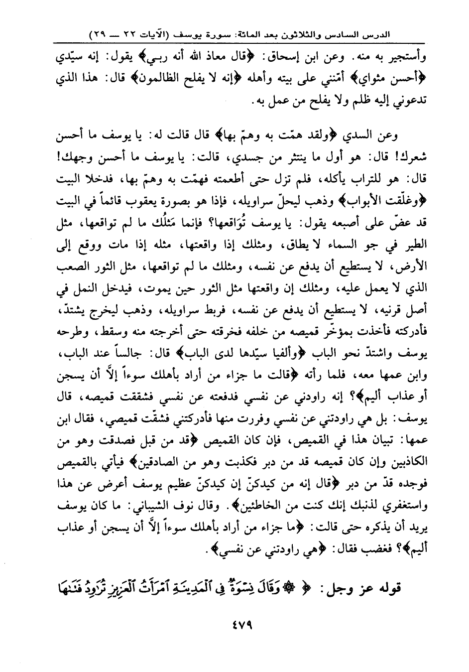 يوسف واشتدّ نحو الباب، {وَأَلْفَيَا سَيِّدَهَا لَدَى الْبَابِ} ، قال: جالسًا عند الباب وابن عمها معه، فلما رأته {قَالَتْ مَا جَزَاء مَنْ أَرَادَ بِأَهْلِكَ سُوَءاً إِلاَّ أَن يُسْجَنَ أَوْ عَذَابٌ أَلِيمٌ} ؟ إنه روادني عن نفسي فدفعته عن نفسي فشققت قميصه، قال يوسف: بل هي روادتني عن نفسي وفررت منها فأدركتني فشقّت قميصي، فقال ابن عمها: تبيان هذا في القميص، فإن كان القميص {قُدَّ مِن قُبُلٍ فَصَدَقَتْ وَهُوَ مِنَ الكَاذِبِينَ * وَإِنْ كَانَ قَمِيصُهُ قُدَّ مِن دُبُرٍ فَكَذَبَتْ وَهُوَ مِن الصَّادِقِينَ} فيأتي بالقميص فوجده قدّ من دبر، {قَالَ إِنَّهُ مِن كَيْدِكُنَّ إِنَّ كَيْدَكُنَّ عَظِيمٌ * يُوسُفُ أَعْرِضْ عَنْ هَذَا وَاسْتَغْفِرِي لِذَنبِكِ إِنَّكِ كُنتِ مِنَ الْخَاطِئِينَ} . وقال نوف الشيباني: ما كان يوسف يريد أن يذكره حتى قالت: {مَا جَزَاء مَنْ أَرَادَ بِأَهْلِكَ سُوَءاً إِلاَّ أَن يُسْجَنَ أَوْ عَذَابٌ أَلِيمٌ} ؟ فغضب فقال: {هِيَ رَاوَدَتْنِي عَن نَّفْسِي} .