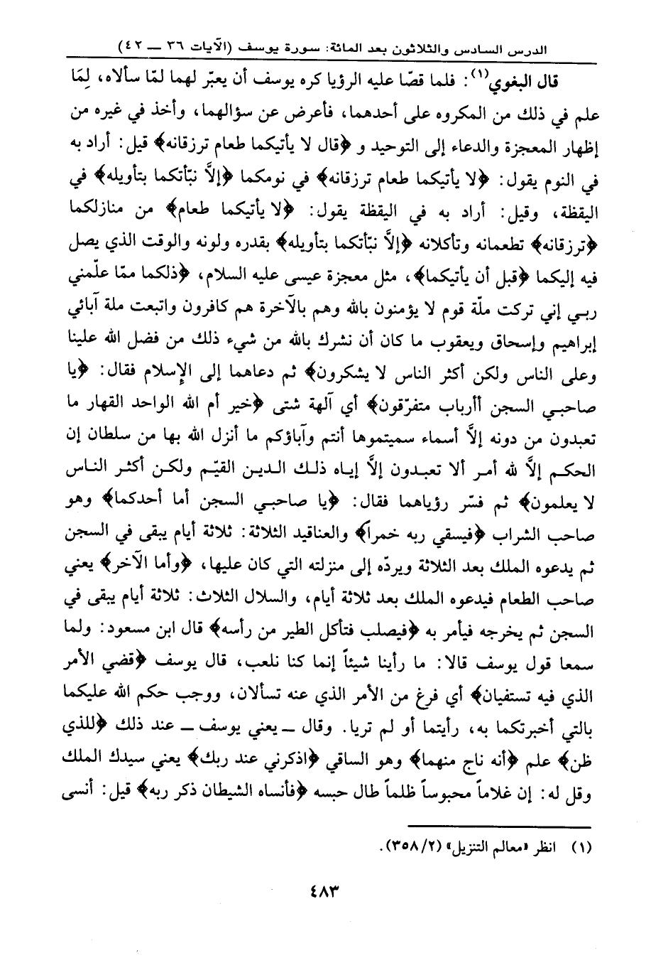 نُّشْرِكَ بِاللهِ مِن شَيْءٍ ذَلِكَ مِن فَضْلِ اللهِ عَلَيْنَا وَعَلَى النَّاسِ وَلَكِنَّ أَكْثَرَ النَّاسِ لاَ يَشْكُرُونَ} ثم دعاهما إلى الإسلام فقال: {يَا صَاحِبَيِ السِّجْنِ أَأَرْبَابٌ مُّتَفَرِّقُونَ} ، أي: آلهة شتى، {خَيْرٌ أَمِ اللهُ الْوَاحِدُ الْقَهَّارُ * مَا تَعْبُدُونَ مِن دُونِهِ إِلاَّ أَسْمَاء سَمَّيْتُمُوهَا أَنتُمْ وَآبَآؤُكُم مَّا أَنزَلَ اللهُ بِهَا مِن سُلْطَانٍ إِنِ الْحُكْمُ إِلاَّ لِلّهِ أَمَرَ أَلاَّ تَعْبُدُواْ إِلاَّ إِيَّاهُ ذَلِكَ الدِّينُ الْقَيِّمُ وَلَكِنَّ أَكْثَرَ النَّاسِ لاَ يَعْلَمُونَ} ثم فسر رؤياهما فقال: {يَا صَاحِبَيِ السِّجْنِ أَمَّا أَحَدُكُمَا} وهو صاحب الشراب، {فَيَسْقِي رَبَّهُ خَمْرًا} والعناقيد الثلاثة: ثلاثة أيام يبقى في السجن ثم يدعوه الملك بعد الثلاثة ويردّه إلى منزلته التي كان عليها، {وَأَمَّا الآخَرُ} ، يعني: صاحب الطعام فيدعوه الملك بعد ثلاثة أيام، والسلال الثلاث: ثلاثة أيام يبقى في السجن ثم يخرجه فيأمر به {فَيُصْلَبُ فَتَأْكُلُ الطَّيْرُ مِنْ رَأْسِهِ} . قال ابن مسعود: ولما سمعا قول يوسف قالا: ما رأينا شيئًا إنمّا كنّا نلعب، قال يوسف: {قُضِيَ الأمْرُ الَّذِي فِيهِ تَسْتَفْتِيَانِ} ، أي: فرغ من الأمر الذي عنه تسألان، ووجب حكم الله عليكما بالتي أخبرتكما به، رأيتما أو لم تريا. وقال - يعني يوسف - عند ذلك: {لِلَّذِي ظَنَّ} علم {أَنَّهُ نَاجٍ مِنْهُمَا} وهو الساقي ... {اذْكُرْنِي عِنْدَ رَبِّكَ} ، يعني: سيدك الملك وقل له: إن غلامًا محبوسًا ظلمًا طال حبسه، {فَأَنْسَاهُ الشَّيْطَانُ ذِكْرَ رَبِّهِ} قيل: أنسى