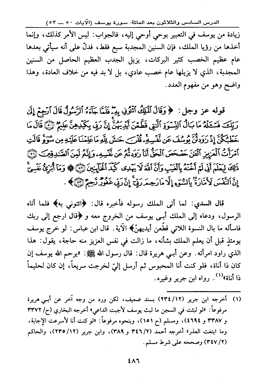 قوله عز وجل: {وَقَالَ الْمَلِكُ ائْتُونِي بِهِ فَلَمَّا جَاءهُ الرَّسُولُ قَالَ ارْجِعْ إِلَى رَبِّكَ فَاسْأَلْهُ مَا بَالُ النِّسْوَةِ اللاَّتِي قَطَّعْنَ أَيْدِيَهُنَّ إِنَّ رَبِّي بِكَيْدِهِنَّ عَلِيمٌ (50) قَالَ مَا خَطْبُكُنَّ إِذْ رَاوَدتُّنَّ يُوسُفَ عَن نَّفْسِهِ قُلْنَ حَاشَ لِلّهِ مَا عَلِمْنَا عَلَيْهِ مِن سُوءٍ قَالَتِ امْرَأَةُ الْعَزِيزِ الآنَ حَصْحَصَ الْحَقُّ أَنَاْ رَاوَدتُّهُ عَن