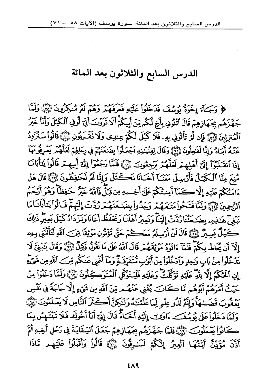 {وَجَاء إِخْوَةُ يُوسُفَ فَدَخَلُواْ عَلَيْهِ فَعَرَفَهُمْ وَهُمْ لَهُ مُنكِرُونَ (58) وَلَمَّا جَهَّزَهُم بِجَهَازِهِمْ قَالَ ائْتُونِي بِأَخٍ لَّكُم مِّنْ أَبِيكُمْ أَلاَ تَرَوْنَ أَنِّي أُوفِي الْكَيْلَ وَأَنَاْ خَيْرُ الْمُنزِلِينَ (59) فَإِن لَّمْ تَأْتُونِي بِهِ فَلاَ كَيْلَ لَكُمْ عِندِي وَلاَ تَقْرَبُونِ (60) قَالُواْ سَنُرَاوِدُ عَنْهُ أَبَاهُ وَإِنَّا لَفَاعِلُونَ (61) وَقَالَ لِفِتْيَانِهِ اجْعَلُواْ بِضَاعَتَهُمْ فِي رِحَالِهِمْ لَعَلَّهُمْ يَعْرِفُونَهَا إِذَا انقَلَبُواْ إِلَى أَهْلِهِمْ لَعَلَّهُمْ يَرْجِعُونَ (62) فَلَمَّا رَجِعُوا إِلَى أَبِيهِمْ قَالُواْ يَا أَبَانَا مُنِعَ مِنَّا الْكَيْلُ فَأَرْسِلْ مَعَنَا أَخَانَا نَكْتَلْ وَإِنَّا لَهُ لَحَافِظُونَ (63) قَالَ هَلْ آمَنُكُمْ عَلَيْهِ إِلاَّ كَمَا أَمِنتُكُمْ عَلَى أَخِيهِ مِن قَبْلُ فَاللهُ خَيْرٌ حَافِظاً وَهُوَ أَرْحَمُ الرَّاحِمِينَ (64) وَلَمَّا فَتَحُواْ مَتَاعَهُمْ وَجَدُواْ بِضَاعَتَهُمْ رُدَّتْ إِلَيْهِمْ قَالُواْ يَا أَبَانَا مَا نَبْغِي هَذِهِ بِضَاعَتُنَا رُدَّتْ إِلَيْنَا وَنَمِيرُ أَهْلَنَا وَنَحْفَظُ أَخَانَا وَنَزْدَادُ كَيْلَ بَعِيرٍ ذَلِكَ كَيْلٌ يَسِيرٌ (65) قَالَ لَنْ أُرْسِلَهُ مَعَكُمْ حَتَّى تُؤْتُونِ مَوْثِقاً مِّنَ اللهِ لَتَأْتُنَّنِي بِهِ إِلاَّ أَن يُحَاطَ بِكُمْ فَلَمَّا آتَوْهُ مَوْثِقَهُمْ قَالَ اللهُ عَلَى مَا نَقُولُ وَكِيلٌ (66) وَقَالَ يَا بَنِيَّ لاَ تَدْخُلُواْ مِن بَابٍ وَاحِدٍ وَادْخُلُواْ مِنْ أَبْوَابٍ مُّتَفَرِّقَةٍ وَمَا أُغْنِي عَنكُم مِّنَ اللهِ مِن شَيْءٍ إِنِ الْحُكْمُ إِلاَّ لِلّهِ عَلَيْهِ تَوَكَّلْتُ وَعَلَيْهِ فَلْيَتَوَكَّلِ الْمُتَوَكِّلُونَ (67) وَلَمَّا دَخَلُواْ مِنْ حَيْثُ أَمَرَهُمْ أَبُوهُم مَّا كَانَ يُغْنِي عَنْهُم مِّنَ اللهِ مِن شَيْءٍ إِلاَّ حَاجَةً فِي نَفْسِ يَعْقُوبَ قَضَاهَا وَإِنَّهُ لَذُو عِلْمٍ لِّمَا عَلَّمْنَاهُ وَلَكِنَّ أَكْثَرَ النَّاسِ لاَ يَعْلَمُونَ (68) وَلَمَّا دَخَلُواْ عَلَى يُوسُفَ