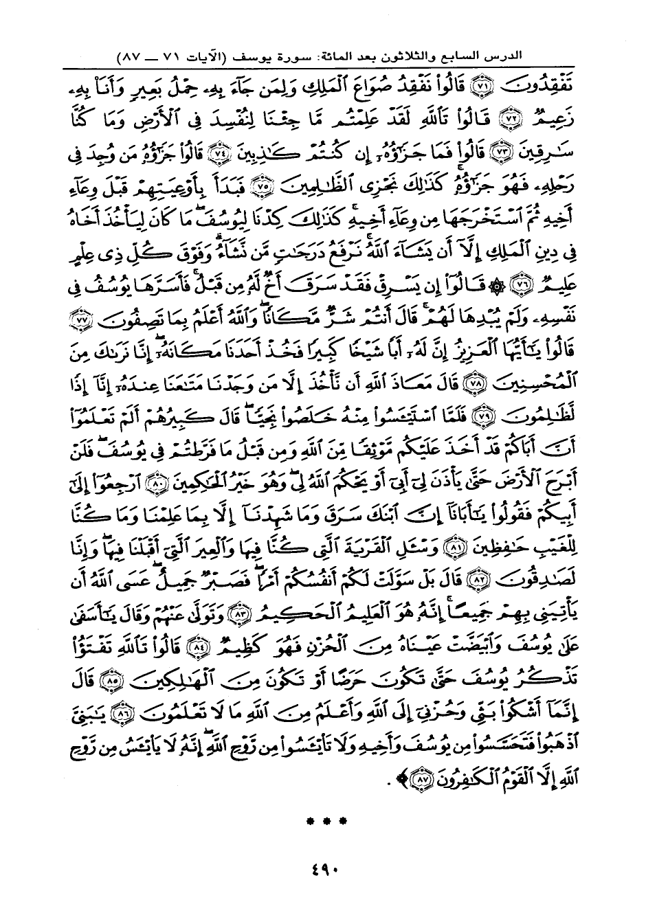 قَالُواْ نَفْقِدُ صُوَاعَ الْمَلِكِ وَلِمَن جَاء بِهِ حِمْلُ بَعِيرٍ وَأَنَاْ بِهِ زَعِيمٌ (72) قَالُواْ تَاللهِ لَقَدْ عَلِمْتُم مَّا جِئْنَا لِنُفْسِدَ فِي الأَرْضِ وَمَا كُنَّا سَارِقِينَ (73) قَالُواْ فَمَا جَزَآؤُهُ إِن كُنتُمْ كَاذِبِينَ (74) قَالُواْ جَزَآؤُهُ مَن وُجِدَ فِي رَحْلِهِ فَهُوَ جَزَاؤُهُ كَذَلِكَ نَجْزِي الظَّالِمِينَ (75) فَبَدَأَ بِأَوْعِيَتِهِمْ قَبْلَ وِعَاء أَخِيهِ ثُمَّ اسْتَخْرَجَهَا مِن وِعَاء أَخِيهِ كَذَلِكَ كِدْنَا لِيُوسُفَ مَا كَانَ لِيَأْخُذَ أَخَاهُ فِي دِينِ الْمَلِكِ إِلاَّ أَن يَشَاءَ اللهُ نَرْفَعُ دَرَجَاتٍ مِّن نَّشَاء وَفَوْقَ كُلِّ ذِي عِلْمٍ عَلِيمٌ (76) قَالُواْ إِن يَسْرِقْ فَقَدْ سَرَقَ أَخٌ لَّهُ مِن قَبْلُ فَأَسَرَّهَا يُوسُفُ فِي نَفْسِهِ وَلَمْ يُبْدِهَا لَهُمْ قَالَ أَنتُمْ شَرٌّ مَّكَاناً وَاللهُ أَعْلَمْ بِمَا تَصِفُونَ (77) قَالُواْ يَا أَيُّهَا الْعَزِيزُ إِنَّ لَهُ أَباً شَيْخاً كَبِيراً فَخُذْ أَحَدَنَا مَكَانَهُ إِنَّا نَرَاكَ مِنَ الْمُحْسِنِينَ (78) قَالَ مَعَاذَ اللهِ أَن نَّأْخُذَ إِلاَّ مَن وَجَدْنَا مَتَاعَنَا عِندَهُ إِنَّا إِذاً لَّظَالِمُونَ (79) فَلَمَّا اسْتَيْأَسُواْ مِنْهُ خَلَصُواْ نَجِيّاً قَالَ كَبِيرُهُمْ أَلَمْ تَعْلَمُواْ أَنَّ أَبَاكُمْ قَدْ أَخَذَ عَلَيْكُم مَّوْثِقاً مِّنَ اللهِ وَمِن قَبْلُ مَا فَرَّطتُمْ فِي يُوسُفَ فَلَنْ أَبْرَحَ الأَرْضَ حَتَّىَ يَأْذَنَ لِي أَبِي أَوْ يَحْكُمَ اللهُ لِي وَهُوَ خَيْرُ الْحَاكِمِينَ (80) ارْجِعُواْ إِلَى أَبِيكُمْ فَقُولُواْ يَا أَبَانَا إِنَّ ابْنَكَ سَرَقَ وَمَا شَهِدْنَا إِلاَّ بِمَا عَلِمْنَا وَمَا كُنَّا لِلْغَيْبِ حَافِظِينَ (81) وَاسْأَلِ الْقَرْيَةَ الَّتِي كُنَّا فِيهَا وَالْعِيْرَ الَّتِي أَقْبَلْنَا فِيهَا