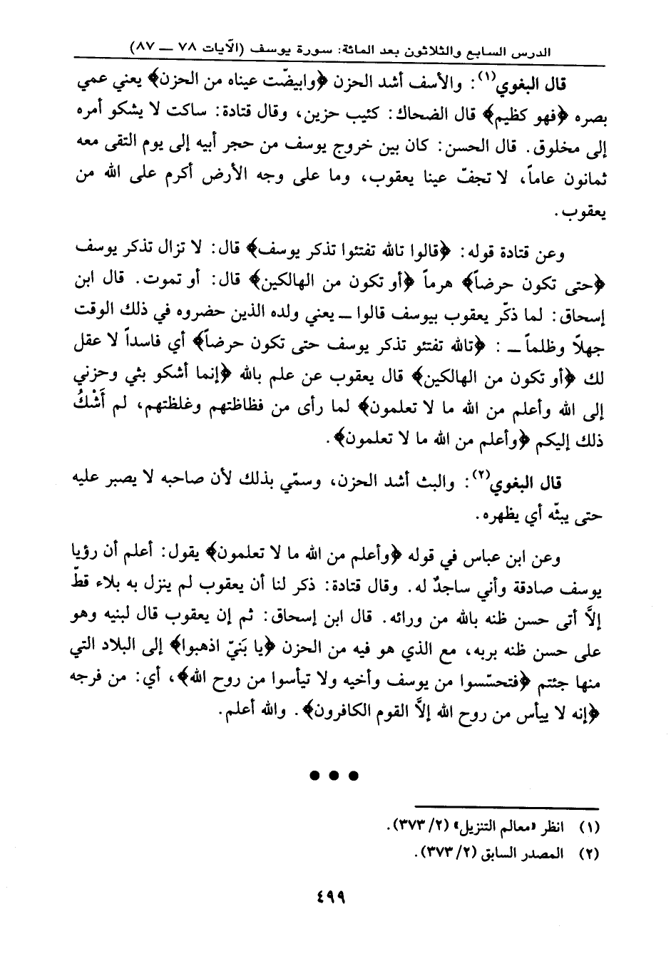 وعن ابن عباس في قوله: {وَأَعْلَمُ مِنَ اللهِ مَا لاَ تَعْلَمُونَ} ، يقول: أعلم أن رؤيا يوسف صادقة وأني ساجدٌ له. وقال قتادة: ذكر لنا أن يعقوب لم ينزل به بلاء قطّ إلا أتى حسن ظنه بالله من ورائه. قال ابن إسحاق: ثم إن يعقوب قال لبنيه وهو على حسن ظنه بربه، مع الذي هو فيه من الحزن {يَا بَنِيَّ اذْهَبُواْ} إلى البلاد التي منها جئتم، {فَتَحَسَّسُواْ مِن يُوسُفَ وَأَخِيهِ وَلاَ تَيْأَسُواْ مِن رَّوْحِ اللهِ} ، أي: من فرجه، {إِنَّهُ لاَ يَيْأَسُ مِن رَّوْحِ اللهِ إِلاَّ الْقَوْمُ الْكَافِرُونَ} . والله أعلم.