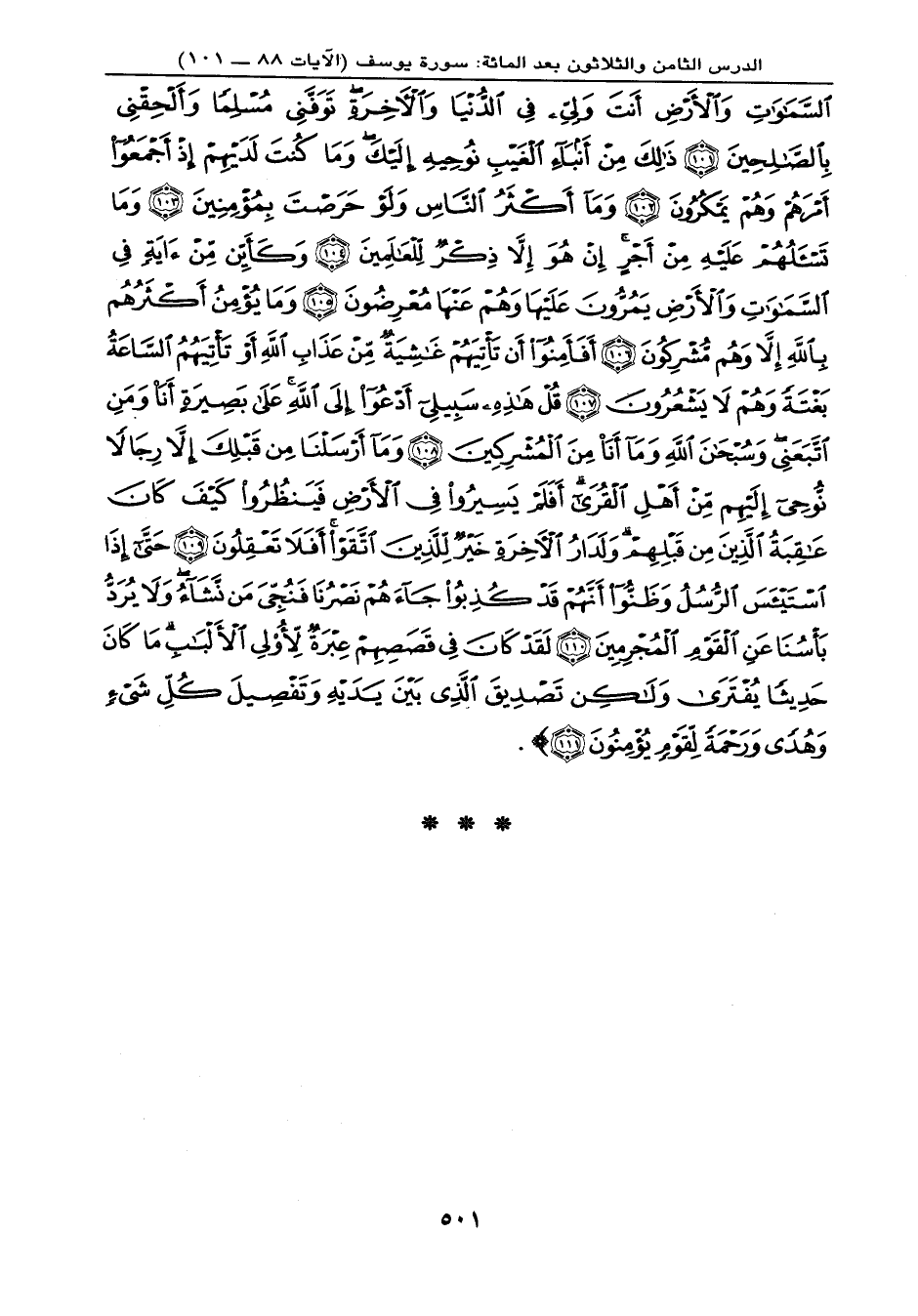 السَّمَاوَاتِ وَالأَرْضِ أَنتَ وَلِيِّي فِي الدُّنُيَا وَالآخِرَةِ تَوَفَّنِي مُسْلِماً وَأَلْحِقْنِي بِالصَّالِحِينَ (101) ذَلِكَ مِنْ أَنبَاء الْغَيْبِ نُوحِيهِ إِلَيْكَ وَمَا كُنتَ لَدَيْهِمْ إِذْ أَجْمَعُواْ أَمْرَهُمْ وَهُمْ يَمْكُرُونَ (102) وَمَا أَكْثَرُ النَّاسِ وَلَوْ حَرَصْتَ بِمُؤْمِنِينَ (103) وَمَا تَسْأَلُهُمْ عَلَيْهِ مِنْ أَجْرٍ إِنْ هُوَ إِلاَّ ذِكْرٌ لِّلْعَالَمِينَ (104) وَكَأَيِّن مِّن آيَةٍ فِي السَّمَاوَاتِ وَالأَرْضِ يَمُرُّونَ عَلَيْهَا وَهُمْ عَنْهَا مُعْرِضُونَ (105) وَمَا يُؤْمِنُ أَكْثَرُهُمْ بِاللهِ إِلاَّ وَهُم مُّشْرِكُونَ (106) أَفَأَمِنُواْ أَن تَأْتِيَهُمْ غَاشِيَةٌ مِّنْ عَذَابِ اللهِ أَوْ تَأْتِيَهُمُ السَّاعَةُ بَغْتَةً وَهُمْ لاَ يَشْعُرُونَ (107) قُلْ هَذِهِ سَبِيلِي أَدْعُو إِلَى اللهِ عَلَى بَصِيرَةٍ أَنَاْ وَمَنِ اتَّبَعَنِي وَسُبْحَانَ اللهِ وَمَا أَنَاْ مِنَ الْمُشْرِكِينَ (108) وَمَا أَرْسَلْنَا مِن قَبْلِكَ إِلاَّ رِجَالاً نُّوحِي إِلَيْهِم مِّنْ أَهْلِ الْقُرَى أَفَلَمْ يَسِيرُواْ فِي الأَرْضِ فَيَنظُرُواْ كَيْفَ كَانَ عَاقِبَةُ الَّذِينَ مِن قَبْلِهِمْ وَلَدَارُ الآخِرَةِ خَيْرٌ لِّلَّذِينَ اتَّقَواْ أَفَلاَ تَعْقِلُونَ (109) حَتَّى إِذَا اسْتَيْأَسَ الرُّسُلُ وَظَنُّواْ أَنَّهُمْ قَدْ كُذِبُواْ جَاءهُمْ نَصْرُنَا فَنُجِّيَ مَن نَّشَاء وَلاَ يُرَدُّ بَأْسُنَا عَنِ الْقَوْمِ الْمُجْرِمِينَ (110) لَقَدْ كَانَ فِي قَصَصِهِمْ عِبْرَةٌ لِّأُوْلِي الأَلْبَابِ مَا كَانَ حَدِيثاً يُفْتَرَى وَلَكِن تَصْدِيقَ الَّذِي بَيْنَ يَدَيْهِ وَتَفْصِيلَ كُلَّ شَيْءٍ وَهُدًى وَرَحْمَةً لِّقَوْمٍ يُؤْمِنُونَ (111) } .