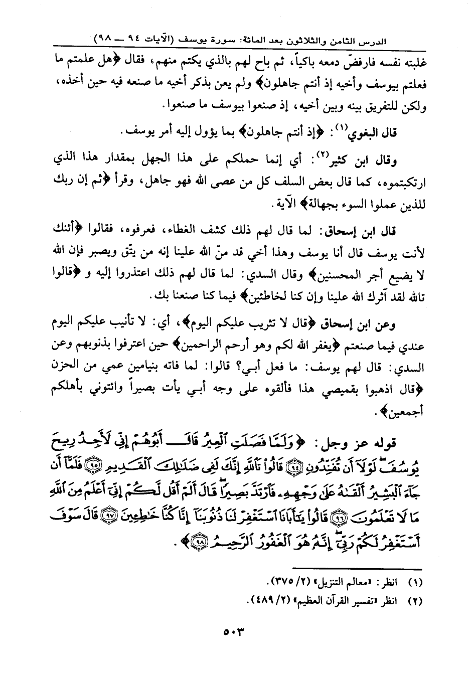 قوله عز وجل: {وَلَمَّا فَصَلَتِ الْعِيرُ قَالَ أَبُوهُمْ إِنِّي لَأَجِدُ رِيحَ يُوسُفَ لَوْلاَ أَن تُفَنِّدُونِ (94) قَالُواْ تَاللهِ إِنَّكَ لَفِي ضَلاَلِكَ الْقَدِيمِ (95) فَلَمَّا أَن جَاء الْبَشِيرُ أَلْقَاهُ عَلَى وَجْهِهِ فَارْتَدَّ بَصِيراً قَالَ أَلَمْ أَقُل لَّكُمْ إِنِّي أَعْلَمُ مِنَ اللهِ مَا لاَ تَعْلَمُونَ (96) قَالُواْ يَا أَبَانَا اسْتَغْفِرْ لَنَا ذُنُوبَنَا إِنَّا ... كُنَّا خَاطِئِينَ (97) قَالَ سَوْفَ أَسْتَغْفِرُ لَكُمْ رَبِّيَ إِنَّهُ هُوَ الْغَفُورُ الرَّحِيمُ (98) } .