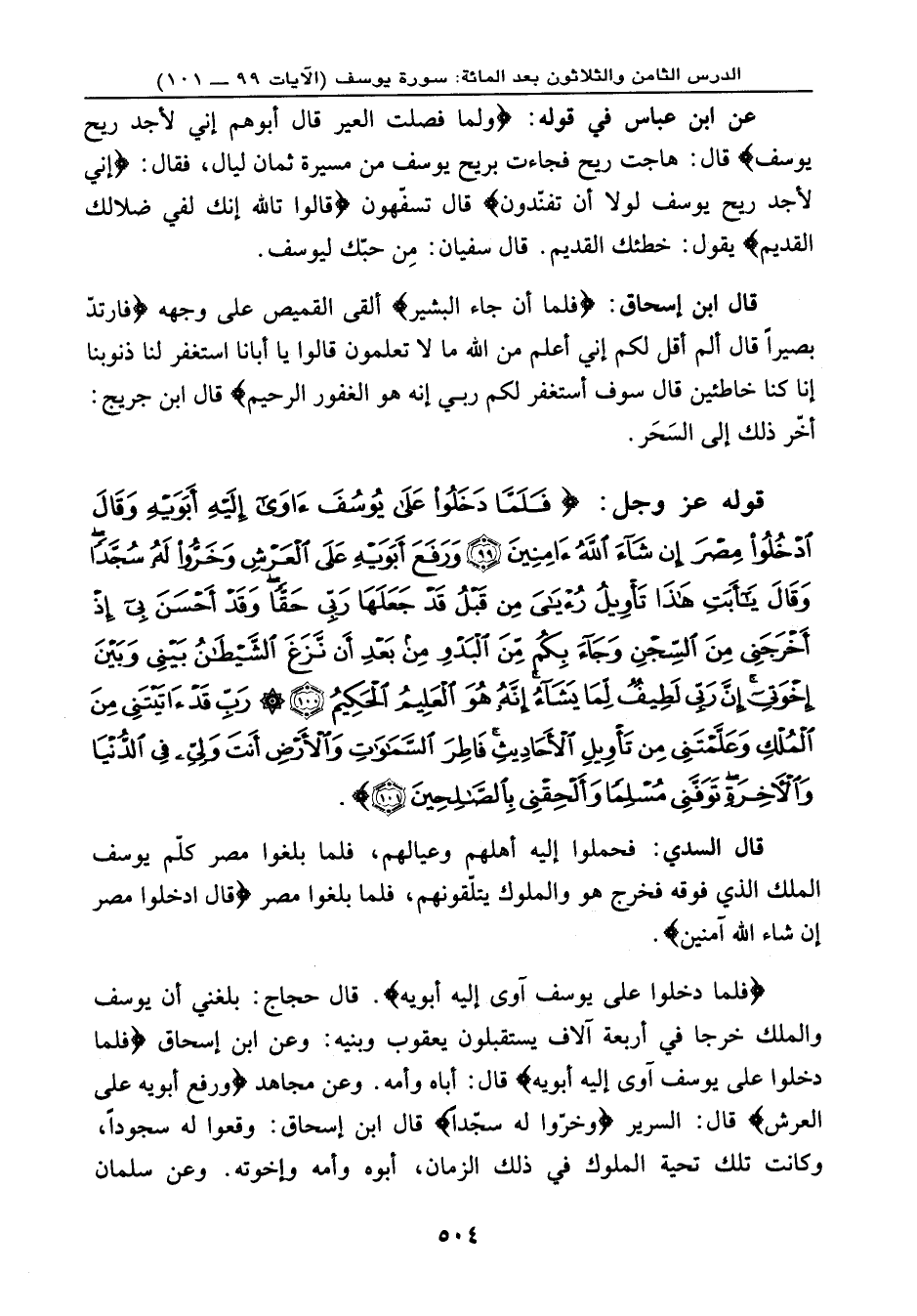 قال ابن إسحاق: {فَلَمَّا أَن جَاء الْبَشِيرُ} ألقى القميص عَلَى وَجْهِهِ {فَارْتَدَّ بَصِيراً قَالَ أَلَمْ أَقُل لَّكُمْ إِنِّي أَعْلَمُ مِنَ اللهِ مَا لاَ تَعْلَمُونَ * قَالُواْ يَا أَبَانَا اسْتَغْفِرْ لَنَا ذُنُوبَنَا إِنَّا كُنَّا خَاطِئِينَ * قَالَ سَوْفَ أَسْتَغْفِرُ لَكُمْ رَبِّيَ إِنَّهُ هُوَ الْغَفُورُ الرَّحِيمُ} ، قال ابن جريج: أخر ذلك إلى السحر.