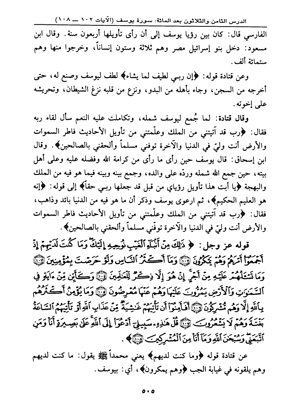 وقال قتادة: لما جُمع ليوسف شمله، وتكاملت عليه النعم سأل لقاء ربه فقال: {رَبِّ قَدْ آتَيْتَنِي مِنَ الْمُلْكِ وَعَلَّمْتَنِي مِن تَأْوِيلِ الأَحَادِيثِ فَاطِرَ السَّمَاوَاتِ وَالأَرْضِ أَنتَ وَلِيِّي فِي الدُّنُيَا وَالآخِرَةِ تَوَفَّنِي مُسْلِماً وَأَلْحِقْنِي بِالصَّالِحِينَ} . وقال ابن إسحاق: قال يوسف حين رأى ما رأى من كرامة الله وفضله عليه وعلى أهل بيته، حين جمع الله شمله وردّه على والده، وجمع بينه وبينه فيما هو فيه من الملك والبهجة: {يَا أَبَتِ هَذَا تَأْوِيلُ رُؤْيَايَ مِن قَبْلُ قَدْ جَعَلَهَا رَبِّي حَقّاً} إلى قوله: {إِنَّهُ هُوَ الْعَلِيمُ الْحَكِيمُ} ، ثم ارعوى يوسف وذكر أن ما هو فيه من الدنيا بائد وذاهب، فقال: {رَبِّ قَدْ آتَيْتَنِي مِنَ الْمُلْكِ وَعَلَّمْتَنِي مِن تَأْوِيلِ الأَحَادِيثِ فَاطِرَ السَّمَاوَاتِ وَالأَرْضِ أَنتَ وَلِيِّي فِي الدُّنُيَا وَالآخِرَةِ تَوَفَّنِي مُسْلِماً وَأَلْحِقْنِي بِالصَّالِحِينَ} .