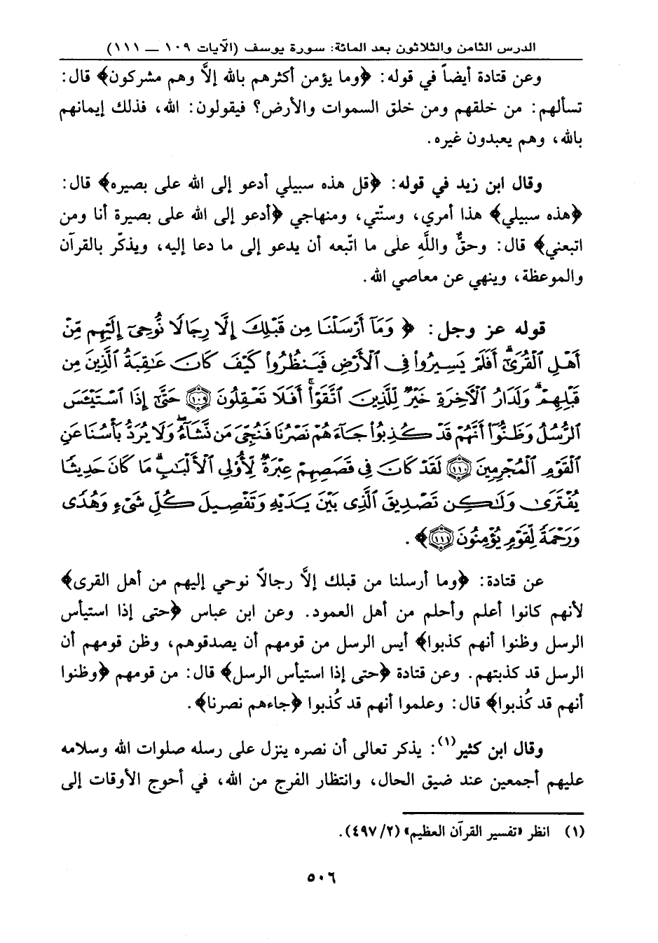 قوله عز وجل: {وَمَا أَرْسَلْنَا مِن قَبْلِكَ إِلاَّ رِجَالاً نُّوحِي إِلَيْهِم مِّنْ أَهْلِ الْقُرَى أَفَلَمْ يَسِيرُواْ فِي الأَرْضِ فَيَنظُرُواْ كَيْفَ كَانَ عَاقِبَةُ الَّذِينَ مِن قَبْلِهِمْ وَلَدَارُ الآخِرَةِ خَيْرٌ لِّلَّذِينَ اتَّقَواْ أَفَلاَ تَعْقِلُونَ (109) حَتَّى إِذَا اسْتَيْأَسَ الرُّسُلُ وَظَنُّواْ أَنَّهُمْ قَدْ كُذِبُواْ جَاءهُمْ نَصْرُنَا فَنُجِّيَ مَن نَّشَاء وَلاَ يُرَدُّ بَأْسُنَا عَنِ الْقَوْمِ الْمُجْرِمِينَ (110) لَقَدْ كَانَ فِي قَصَصِهِمْ عِبْرَةٌ لِّأُوْلِي