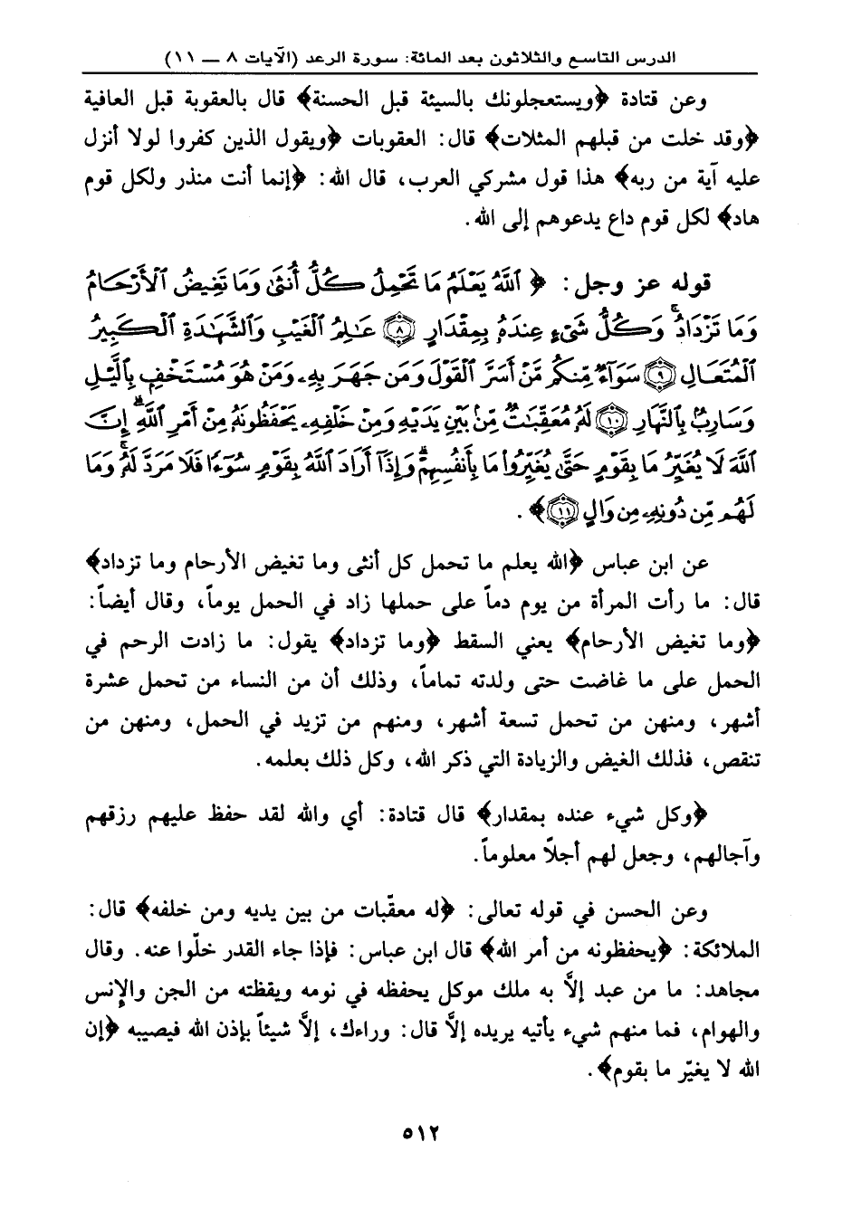 قوله عز وجل: {اللهُ يَعْلَمُ مَا تَحْمِلُ كُلُّ أُنثَى وَمَا تَغِيضُ الأَرْحَامُ وَمَا تَزْدَادُ وَكُلُّ شَيْءٍ عِندَهُ بِمِقْدَارٍ (8) عَالِمُ الْغَيْبِ وَالشَّهَادَةِ الْكَبِيرُ الْمُتَعَالِ (9) سَوَاء مِّنكُم مَّنْ أَسَرَّ الْقَوْلَ وَمَن جَهَرَ بِهِ وَمَنْ هُوَ مُسْتَخْفٍ بِاللَّيْلِ وَسَارِبٌ بِالنَّهَارِ (10) لَهُ مُعَقِّبَاتٌ مِّن بَيْنِ يَدَيْهِ وَمِنْ خَلْفِهِ يَحْفَظُونَهُ مِنْ أَمْرِ اللهِ إِنَّ اللهَ لاَ يُغَيِّرُ مَا بِقَوْمٍ حَتَّى يُغَيِّرُواْ مَا بِأَنْفُسِهِمْ وَإِذَا أَرَادَ اللهُ بِقَوْمٍ سُوءاً فَلاَ مَرَدَّ لَهُ وَمَا لَهُم مِّن دُونِهِ مِن وَالٍ (11) } .