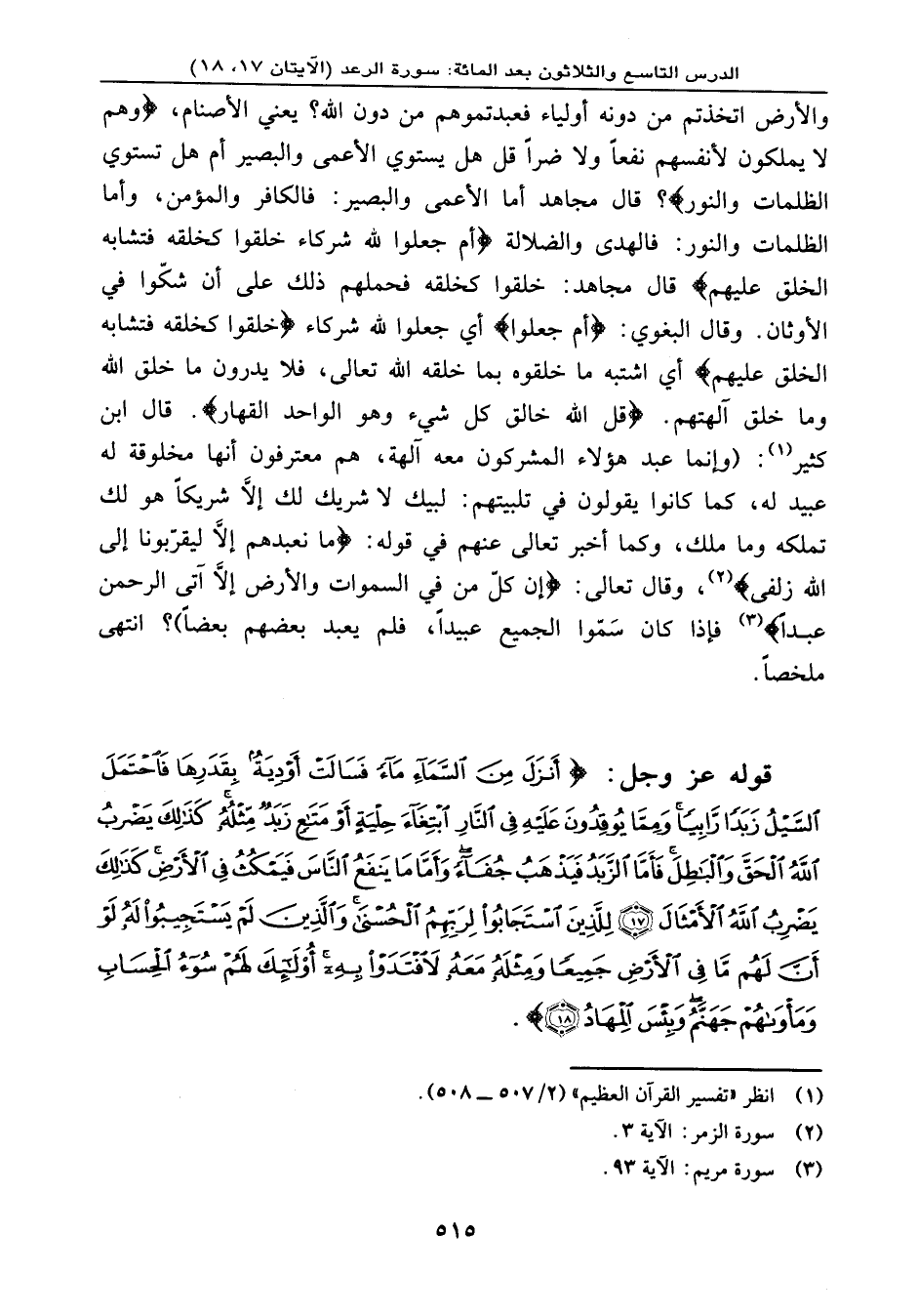 النَّاسَ فَيَمْكُثُ فِي الأَرْضِ كَذَلِكَ يَضْرِبُ اللهُ الأَمْثَالَ (17) لِلَّذِينَ اسْتَجَابُواْ لِرَبِّهِمُ الْحُسْنَى وَالَّذِينَ لَمْ يَسْتَجِيبُواْ لَهُ لَوْ أَنَّ لَهُم مَّا فِي الأَرْضِ جَمِيعاً وَمِثْلَهُ مَعَهُ لاَفْتَدَوْاْ بِهِ أُوْلَئِكَ لَهُمْ سُوءُ الْحِسَابِ وَمَأْوَاهُمْ جَهَنَّمُ وَبِئْسَ الْمِهَادُ (18) } .