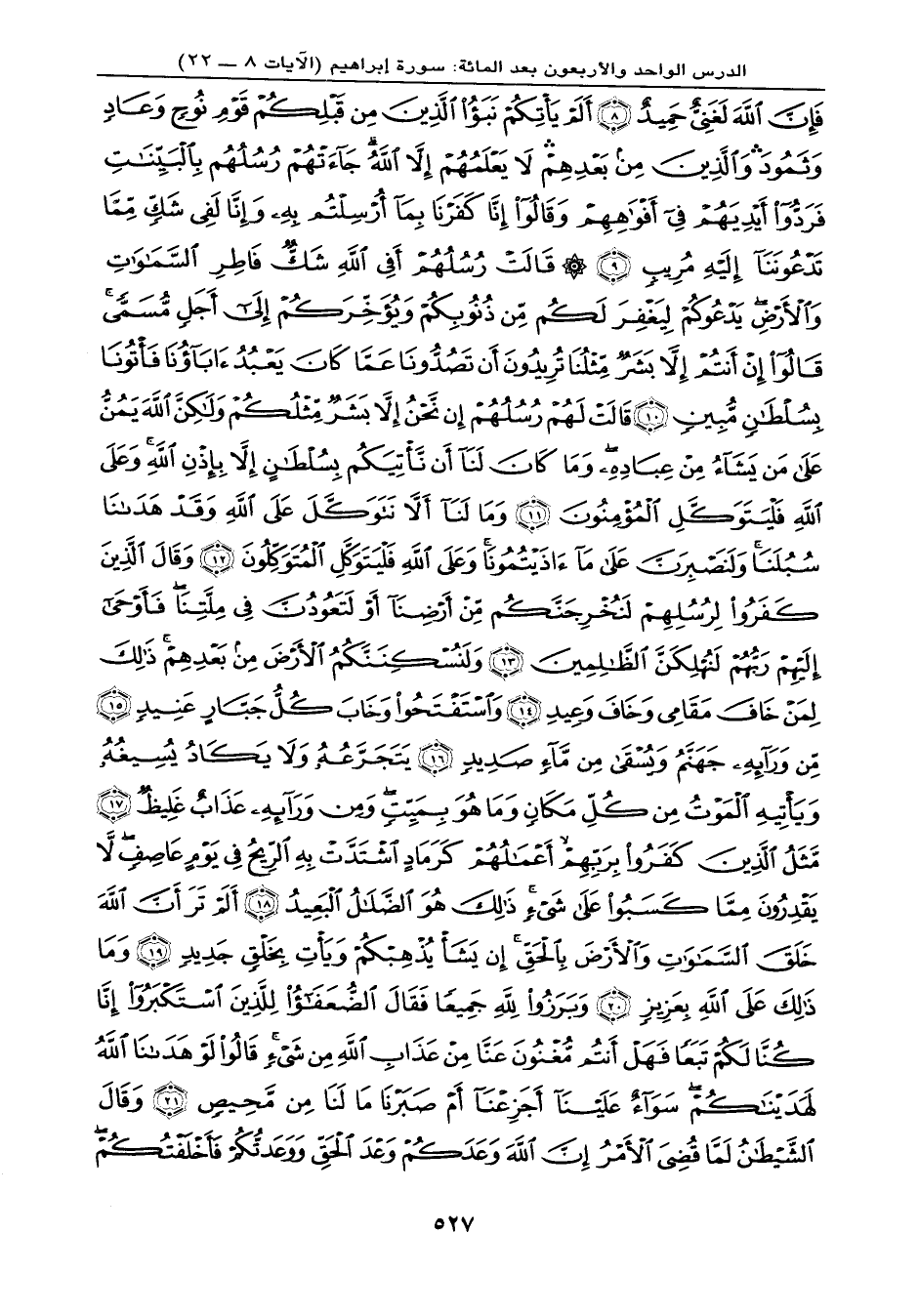 أَفْوَاهِهِمْ وَقَالُواْ إِنَّا كَفَرْنَا بِمَا أُرْسِلْتُم بِهِ وَإِنَّا لَفِي شَكٍّ مِّمَّا تَدْعُونَنَا إِلَيْهِ مُرِيبٍ (9) قَالَتْ رُسُلُهُمْ أَفِي اللهِ شَكٌّ فَاطِرِ السَّمَاوَاتِ وَالأَرْضِ يَدْعُوكُمْ لِيَغْفِرَ لَكُم مِّن ذُنُوبِكُمْ وَيُؤَخِّرَكُمْ إِلَى أَجَلٍ مُّسَمًّى قَالُواْ إِنْ أَنتُمْ إِلاَّ بَشَرٌ مِّثْلُنَا تُرِيدُونَ أَن تَصُدُّونَا عَمَّا كَانَ يَعْبُدُ آبَآؤُنَا فَأْتُونَا بِسُلْطَانٍ مُّبِينٍ (10) قَالَتْ لَهُمْ رُسُلُهُمْ إِن نَّحْنُ إِلاَّ بَشَرٌ مِّثْلُكُمْ وَلَكِنَّ اللهَ يَمُنُّ عَلَى مَن يَشَاءُ مِنْ عِبَادِهِ وَمَا كَانَ لَنَا أَن نَّأْتِيَكُم بِسُلْطَانٍ إِلاَّ بِإِذْنِ اللهِ وَعلَى اللهِ فَلْيَتَوَكَّلِ الْمُؤْمِنُونَ (11) وَمَا لَنَا أَلاَّ نَتَوَكَّلَ عَلَى اللهِ وَقَدْ هَدَانَا سُبُلَنَا وَلَنَصْبِرَنَّ عَلَى مَا آذَيْتُمُونَا وَعَلَى اللهِ فَلْيَتَوَكَّلِ الْمُتَوَكِّلُونَ (12) وَقَالَ الَّذِينَ كَفَرُواْ لِرُسُلِهِمْ لَنُخْرِجَنَّكُم مِّنْ أَرْضِنَا أَوْ لَتَعُودُنَّ فِي مِلَّتِنَا فَأَوْحَى إِلَيْهِمْ رَبُّهُمْ لَنُهْلِكَنَّ الظَّالِمِينَ (13) وَلَنُسْكِنَنَّكُمُ الأَرْضَ مِن بَعْدِهِمْ ذَلِكَ لِمَنْ خَافَ مَقَامِي وَخَافَ وَعِيدِ (14) وَاسْتَفْتَحُواْ وَخَابَ كُلُّ جَبَّارٍ عَنِيدٍ (15) مِّن وَرَآئِهِ جَهَنَّمُ وَيُسْقَى مِن مَّاء صَدِيدٍ (16) يَتَجَرَّعُهُ وَلاَ يَكَادُ يُسِيغُهُ وَيَأْتِيهِ الْمَوْتُ مِن كُلِّ مَكَانٍ وَمَا هُوَ بِمَيِّتٍ وَمِن وَرَآئِهِ عَذَابٌ غَلِيظٌ (17) مَّثَلُ الَّذِينَ كَفَرُواْ بِرَبِّهِمْ أَعْمَالُهُمْ كَرَمَادٍ اشْتَدَّتْ بِهِ الرِّيحُ فِي يَوْمٍ عَاصِفٍ لاَّ يَقْدِرُونَ مِمَّا كَسَبُواْ عَلَى شَيْءٍ ذَلِكَ هُوَ الضَّلاَلُ الْبَعِيدُ (18) أَلَمْ تَرَ أَنَّ اللهَ خَلَقَ السَّمَاوَاتِ وَالأَرْضَ بِالْحقِّ إِن يَشَأْ يُذْهِبْكُمْ وَيَأْتِ بِخَلْقٍ جَدِيدٍ (19) وَمَا ذَلِكَ عَلَى اللَّهِ بِعَزِيزٍ (20) وَبَرَزُواْ لِلّهِ جَمِيعاً فَقَالَ الضُّعَفَاء لِلَّذِينَ اسْتَكْبَرُواْ إِنَّا كُنَّا لَكُمْ تَبَعاً فَهَلْ أَنتُم مُّغْنُونَ عَنَّا مِنْ عَذَابِ اللهِ مِن
