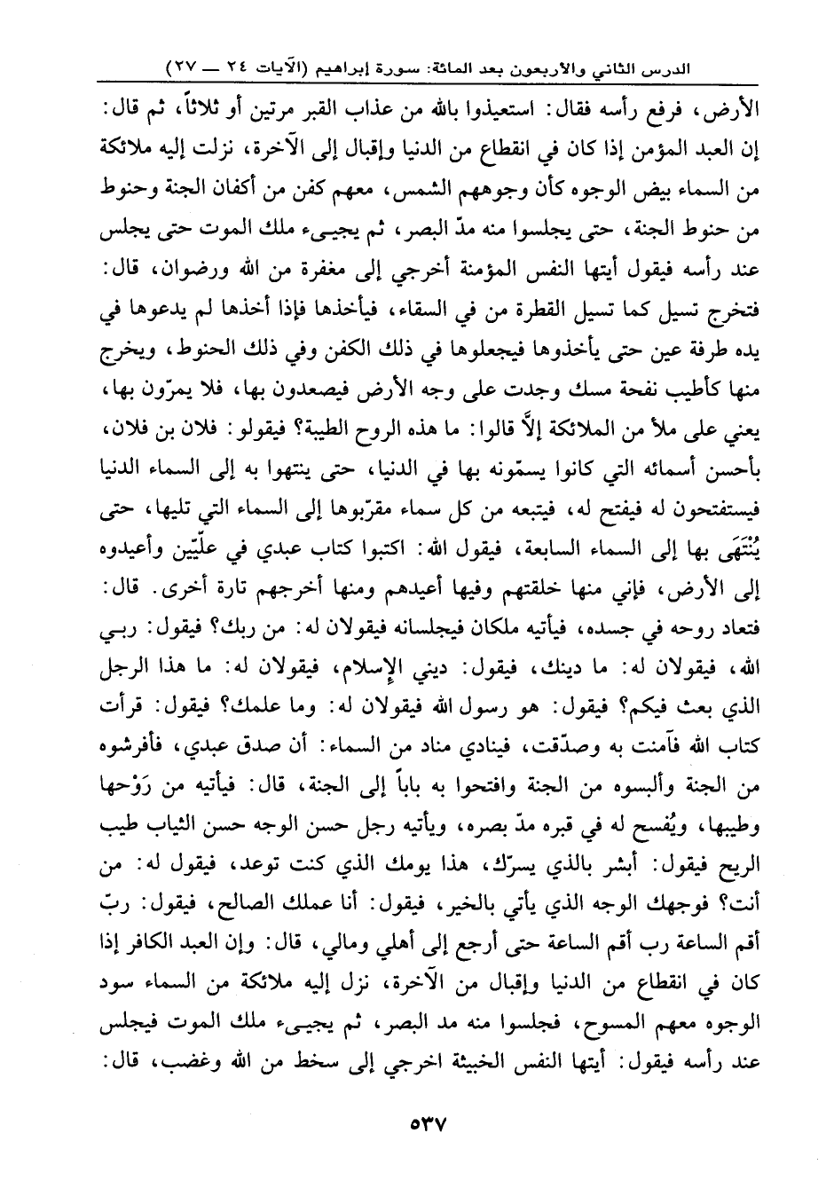 الأرض، فرفع رأسه فقال: «استعيذوا بالله من عذاب القبر» . مرتين أو ثلاثًا، ثم قال: «إن العبد المؤمن إذا كان في انقطاع من الدنيا وإقبال إلى الآخرة، نزلت إليه ملائكة من السماء بيض الوجوه كأن وجوههم الشمس، معهم كفن من أكفان الجنة وحنوط من حنوط الجنة، حتى يجلسوا منه مدّ البصر، ثم يجيء ملك الموت حتى يجلس عند رأسه فيقول: أيتها النفس المؤمنة اخرجي إلى مغفرة من الله ورضوان، قال: فتخرج تسيل كما تسيل القطرة من في السقاء، فيأخذها فإذا أخذها لم يدعوها في يده طرفة عين حتى يأخذوها فيجعلوها في ذلك الكفن وفي ذلك الحنوط، ويخرج منها كأطيب نفحة مسك وجدت على وجه الأرض فيصعدون بها، فلا يمرّون بها، يعني: على ملأ من الملائكة إلا قالوا: ما هذه الروح الطيبة؟ فيقولون: فلان بن فلان، بأحسن أسمائه التي كانوا يسمّونه بها في الدنيا، حتى ينتهوا بها إلى السماء الدنيا فيستفتحون له فيفتح له، فيتبعه من كل سماء مقرّبوها إلى السماء التي تليها، حتى يُنْتَهَى بها إلى السماء السابعة، فيقول الله: اكتبوا كتاب عبدي في عِلّيّين وأعيدوه إلى الأرض، فإني منها خلقتهم وفيها أعيدهم ومنها أخرجهم تارة أخرى. قال: فتعاد روحه في جسده، فيأتيه ملكان فيجلسانه فيقولان له: من ربك؟ فيقول: ربي الله، فيقولان له: ما دينك، فيقول: ديني الإسلام، فيقولان له: ما
