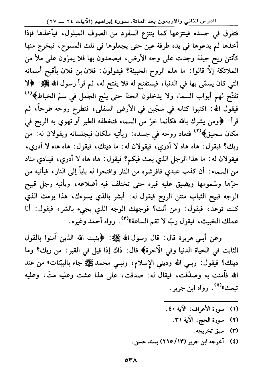 وعن أبي هريرة قال: قال رسول الله - صلى الله عليه وسلم -: « {يُثَبِّتُ اللهُ الَّذِينَ آمَنُواْ بِالْقَوْلِ الثَّابِتِ فِي الْحَيَاةِ الدُّنْيَا وَفِي الآخِرَةِ} ، قال: ذاك إذا قيل في القبر: من ربك؟ وما دينك؟ فيقول: ربي الله وديني الإسلام، ونبيي محمد - صلى الله عليه وسلم - جاء بالبيّنات من عند الله فآمنت به وصدّقت، فيقال له: صدقت، على هذا عشت وعليه متّ، وعليه تبعث» . رواه ابن جرير.