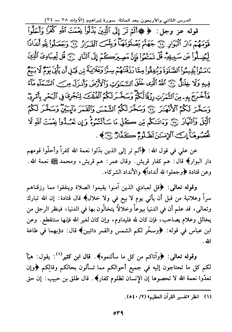 لِّعِبَادِيَ الَّذِينَ آمَنُواْ يُقِيمُواْ الصَّلاَةَ وَيُنفِقُواْ مِمَّا رَزَقْنَاهُمْ سِرّاً وَعَلانِيَةً مِّن قَبْلِ أَن يَأْتِيَ يَوْمٌ لاَّ بَيْعٌ فِيهِ وَلاَ خِلاَلٌ (31) اللهُ الَّذِي خَلَقَ السَّمَاوَاتِ وَالأَرْضَ وَأَنزَلَ مِنَ السَّمَاءِ مَاءً فَأَخْرَجَ بِهِ مِنَ الثَّمَرَاتِ رِزْقاً لَّكُمْ وَسَخَّرَ لَكُمُ الْفُلْكَ لِتَجْرِيَ فِي الْبَحْرِ بِأَمْرِهِ وَسَخَّرَ لَكُمُ الأَنْهَارَ (32) وَسَخَّر لَكُمُ الشَّمْسَ وَالْقَمَرَ دَآئِبَينَ وَسَخَّرَ لَكُمُ اللَّيْلَ وَالنَّهَارَ (33) وَآتَاكُم مِّن كُلِّ مَا سَأَلْتُمُوهُ وَإِن تَعُدُّواْ نِعْمَتَ اللهِ لاَ تُحْصُوهَا إِنَّ الإِنسَانَ لَظَلُومٌ كَفَّارٌ (34) } .