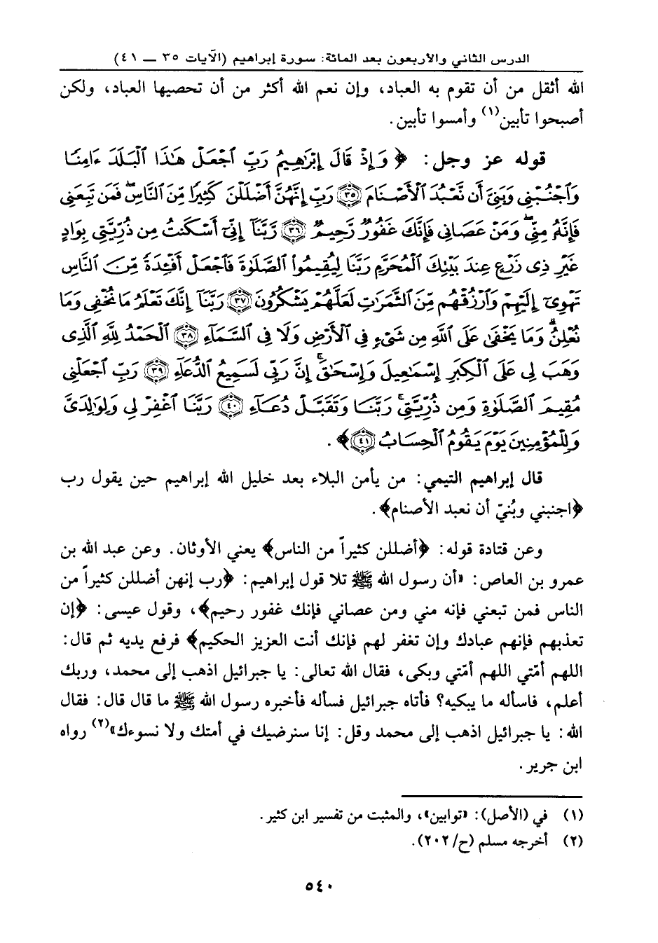 قوله عز وجل: {وَإِذْ قَالَ إِبْرَاهِيمُ رَبِّ اجْعَلْ هَذَا الْبَلَدَ آمِناً وَاجْنُبْنِي وَبَنِيَّ أَن نَّعْبُدَ الأَصْنَامَ (35) رَبِّ إِنَّهُنَّ أَضْلَلْنَ كَثِيراً مِّنَ النَّاسِ فَمَن تَبِعَنِي فَإِنَّهُ مِنِّي وَمَنْ عَصَانِي فَإِنَّكَ غَفُورٌ رَّحِيمٌ (36) رَّبَّنَا إِنِّي أَسْكَنتُ مِن ذُرِّيَّتِي بِوَادٍ غَيْرِ ذِي زَرْعٍ عِندَ بَيْتِكَ الْمُحَرَّمِ رَبَّنَا لِيُقِيمُواْ الصَّلاَةَ فَاجْعَلْ أَفْئِدَةً مِّنَ النَّاسِ تَهْوِي إِلَيْهِمْ وَارْزُقْهُم مِّنَ الثَّمَرَاتِ لَعَلَّهُمْ يَشْكُرُونَ (37) رَبَّنَا إِنَّكَ تَعْلَمُ مَا نُخْفِي وَمَا نُعْلِنُ وَمَا يَخْفَى عَلَى اللهِ مِن شَيْءٍ فَي الأَرْضِ وَلاَ فِي السَّمَاء (38) الْحَمْدُ لِلّهِ الَّذِي وَهَبَ لِي عَلَى الْكِبَرِ إِسْمَاعِيلَ وَإِسْحَاقَ إِنَّ رَبِّي لَسَمِيعُ الدُّعَاء (39) رَبِّ اجْعَلْنِي مُقِيمَ الصَّلاَةِ وَمِن ذُرِّيَّتِي رَبَّنَا وَتَقَبَّلْ دُعَاء (40) رَبَّنَا اغْفِرْ لِي وَلِوَالِدَيَّ وَلِلْمُؤْمِنِينَ يَوْمَ يَقُومُ الْحِسَابُ (41) } .