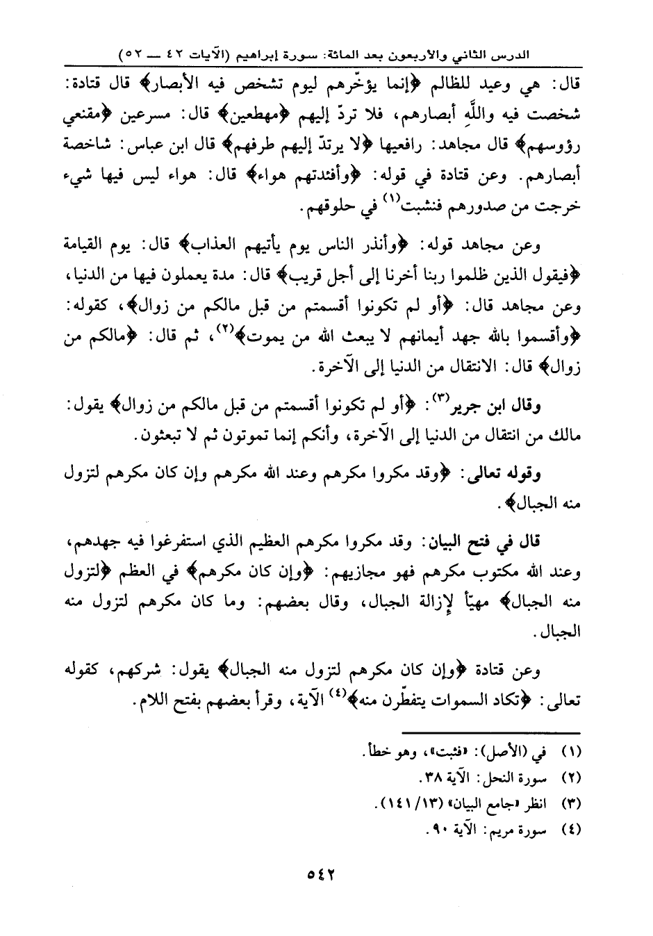 قال: هي وعيد للظالم {إِنَّمَا يُؤَخِّرُهُمْ لِيَوْمٍ تَشْخَصُ فِيهِ الأَبْصَارُ} ، قال قتادة: شخصت فيه واللهِ أبصارهم، فلا تردّ إليهم، ... {مُهْطِعِينَ} ، قال: مسرعين {مُقْنِعِي رُءُوسِهِمْ} ، قال مجاهد: رافعيها {لاَ يَرْتَدُّ إِلَيْهِمْ طَرْفُهُمْ} ، قال ابن عباس: شاخصة أبصارهم. وعن قتادة في قوله: {وَأَفْئِدَتُهُمْ هَوَاء} ، قال: هواء ليس فيها شيء خرجت من صدورهم فنشبت في حلوقهم.