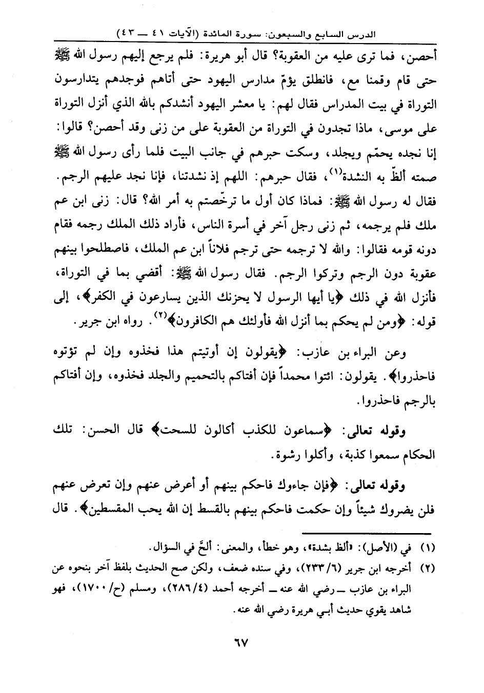 أحصن، فما ترى عليه من العقوبة؟ قال أبو هريرة: فلم يرجع إليهم رسول الله - صلى الله عليه وسلم - حتى قام وقمنا معه، فانطلق يؤمّ مدارس اليهود حتى أتاهم فوجدهم يتدارسون التوراة في بيت المدارس فقال لهم: «يا معشر اليهود أنشدكم بالله الذي أنزل التوراة على موسى، ماذا تجدون في التوراة من العقوبة على من زنى وقد أحصن» ؟ قالوا: إنا نجده يحمّم ويجلد، وسكت حبرهم في جانب البيت فلما رأى رسول الله - صلى الله عليه وسلم - صمته ألظّ به النشدة، فقال حبرهم: اللهم إذ نشدتنا، فإنا نجد عليهم الرجم. فقال له رسول الله - صلى الله عليه وسلم -: «فماذا كان أول ما ترخّصتم به أمر الله» ؟ قال: زنى ابن عم ملك فلم يرجمه، ثم زنى رجل آخر في أسرة الناس، فأراد ذلك الملك رجمه فقام دونه قومه فقالوا: والله لا ترجمه حتى ترجم فلانًا ابن عم الملك، فاصطلحوا بينهم عقوبة دون الرجم وتركوا الرجم. فقال رسول الله - صلى الله عليه وسلم -: «أقضي بما في التوراة» ، فأنزل الله في ذلك: {يَا أَيُّهَا الرَّسُولُ لاَ يَحْزُنكَ الَّذِينَ يُسَارِعُونَ فِي الْكُفْرِ} إلى قوله: {وَمَن لَّمْ يَحْكُم بِمَا أَنزَلَ اللهُ فَأُوْلَئِكَ هُمُ الْكَافِرُونَ} . رواه ابن جرير.