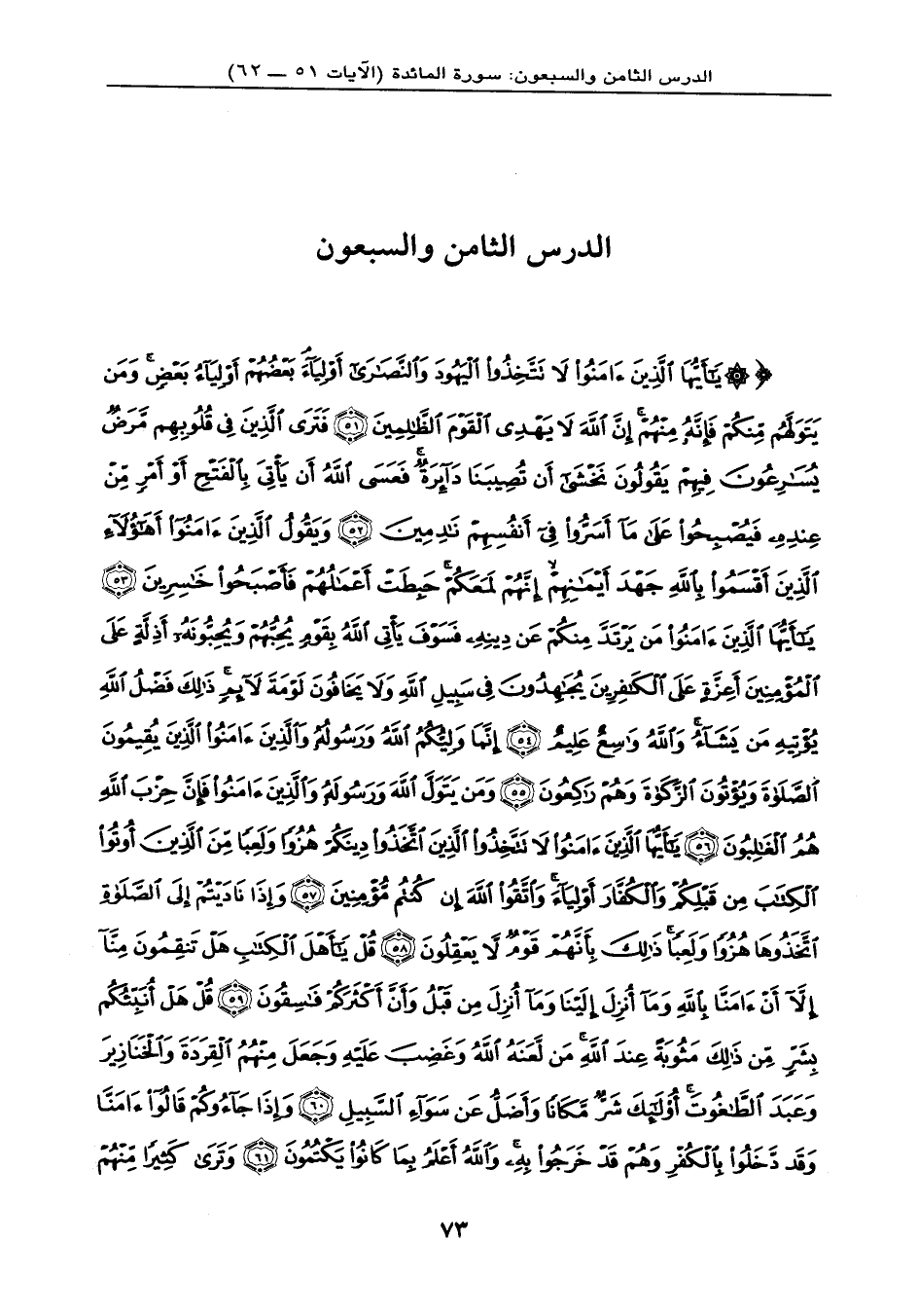 {يَا أَيُّهَا الَّذِينَ آمَنُواْ لاَ تَتَّخِذُواْ الْيَهُودَ وَالنَّصَارَى أَوْلِيَاء بَعْضُهُمْ أَوْلِيَاء بَعْضٍ وَمَن يَتَوَلَّهُم مِّنكُمْ فَإِنَّهُ مِنْهُمْ إِنَّ اللهَ لاَ يَهْدِي الْقَوْمَ الظَّالِمِينَ (51) فَتَرَى الَّذِينَ فِي قُلُوبِهِم مَّرَضٌ يُسَارِعُونَ فِيهِمْ يَقُولُونَ نَخْشَى أَن تُصِيبَنَا دَآئِرَةٌ فَعَسَى اللهُ أَن يَأْتِيَ بِالْفَتْحِ أَوْ أَمْرٍ مِّنْ عِندِهِ فَيُصْبِحُواْ عَلَى مَا أَسَرُّواْ فِي أَنْفُسِهِمْ نَادِمِينَ (52) وَيَقُولُ الَّذِينَ آمَنُواْ أَهَؤُلاء الَّذِينَ أَقْسَمُواْ بِاللهِ جَهْدَ أَيْمَانِهِمْ إِنَّهُمْ لَمَعَكُمْ حَبِطَتْ أَعْمَالُهُمْ فَأَصْبَحُواْ خَاسِرِينَ (53) يَا أَيُّهَا الَّذِينَ آمَنُواْ مَن يَرْتَدَّ مِنكُمْ عَن دِينِهِ فَسَوْفَ يَأْتِي اللهُ بِقَوْمٍ يُحِبُّهُمْ وَيُحِبُّونَهُ أَذِلَّةٍ عَلَى الْمُؤْمِنِينَ أَعِزَّةٍ عَلَى الْكَافِرِينَ يُجَاهِدُونَ فِي سَبِيلِ اللهِ وَلاَ يَخَافُونَ لَوْمَةَ لآئِمٍ ذَلِكَ فَضْلُ اللهِ يُؤْتِيهِ مَن يَشَاءُ وَاللهُ وَاسِعٌ عَلِيمٌ (54) إِنَّمَا وَلِيُّكُمُ اللهُ وَرَسُولُهُ وَالَّذِينَ آمَنُواْ الَّذِينَ يُقِيمُونَ الصَّلاَةَ وَيُؤْتُونَ الزَّكَاةَ وَهُمْ رَاكِعُونَ (55) وَمَن يَتَوَلَّ اللهَ وَرَسُولَهُ وَالَّذِينَ آمَنُواْ فَإِنَّ حِزْبَ اللهِ هُمُ الْغَالِبُونَ (56) يَا أَيُّهَا الَّذِينَ آمَنُواْ لاَ تَتَّخِذُواْ الَّذِينَ اتَّخَذُواْ دِينَكُمْ هُزُواً وَلَعِباً مِّنَ الَّذِينَ أُوتُواْ الْكِتَابَ مِن قَبْلِكُمْ وَالْكُفَّارَ أَوْلِيَاء وَاتَّقُواْ اللهَ إِن كُنتُم مُّؤْمِنِينَ (57) وَإِذَا نَادَيْتُمْ إِلَى الصَّلاَةِ اتَّخَذُوهَا هُزُواً وَلَعِباً ذَلِكَ بِأَنَّهُمْ قَوْمٌ لاَّ يَعْقِلُونَ (58) قُلْ يَا أَهْلَ الْكِتَابِ هَلْ تَنقِمُونَ مِنَّا إِلاَّ أَنْ آمَنَّا بِاللهِ وَمَا أُنزِلَ إِلَيْنَا وَمَا أُنزِلَ مِن قَبْلُ وَأَنَّ أَكْثَرَكُمْ فَاسِقُونَ (59) قُلْ هَلْ أُنَبِّئُكُم بِشَرٍّ مِّن ذَلِكَ مَثُوبَةً عِندَ اللهِ مَن