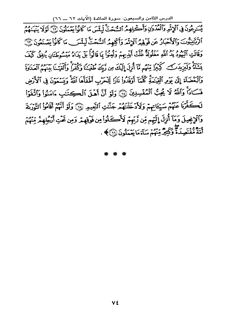 يُسَارِعُونَ فِي الإِثْمِ وَالْعُدْوَانِ وَأَكْلِهِمُ السُّحْتَ لَبِئْسَ مَا كَانُواْ يَعْمَلُونَ (62) لَوْلاَ يَنْهَاهُمُ الرَّبَّانِيُّونَ وَالأَحْبَارُ عَن قَوْلِهِمُ الإِثْمَ وَأَكْلِهِمُ السُّحْتَ لَبِئْسَ مَا كَانُواْ يَصْنَعُونَ (63) وَقَالَتِ الْيَهُودُ يَدُ اللهِ مَغْلُولَةٌ غُلَّتْ أَيْدِيهِمْ وَلُعِنُواْ بِمَا قَالُواْ بَلْ يَدَاهُ مَبْسُوطَتَانِ يُنفِقُ كَيْفَ يَشَاءُ وَلَيَزِيدَنَّ كَثِيراً مِّنْهُم مَّا أُنزِلَ إِلَيْكَ مِن رَّبِّكَ طُغْيَاناً وَكُفْراً وَأَلْقَيْنَا بَيْنَهُمُ الْعَدَاوَةَ وَالْبَغْضَاء إِلَى يَوْمِ الْقِيَامَةِ كُلَّمَا أَوْقَدُواْ نَاراً لِّلْحَرْبِ أَطْفَأَهَا اللهُ وَيَسْعَوْنَ فِي الأَرْضِ فَسَاداً وَاللهُ لاَ يُحِبُّ الْمُفْسِدِينَ (64) وَلَوْ أَنَّ أَهْلَ الْكِتَابِ آمَنُواْ وَاتَّقَوْاْ لَكَفَّرْنَا عَنْهُمْ سَيِّئَاتِهِمْ وَلأدْخَلْنَاهُمْ جَنَّاتِ النَّعِيمِ (65) وَلَوْ أَنَّهُمْ أَقَامُواْ التَّوْرَاةَ وَالإِنجِيلَ وَمَا أُنزِلَ إِلَيهِم مِّن رَّبِّهِمْ لأكَلُواْ مِن فَوْقِهِمْ وَمِن تَحْتِ أَرْجُلِهِم مِّنْهُمْ أُمَّةٌ مُّقْتَصِدَةٌ وَكَثِيرٌ مِّنْهُمْ سَاء مَا يَعْمَلُونَ (66) } .