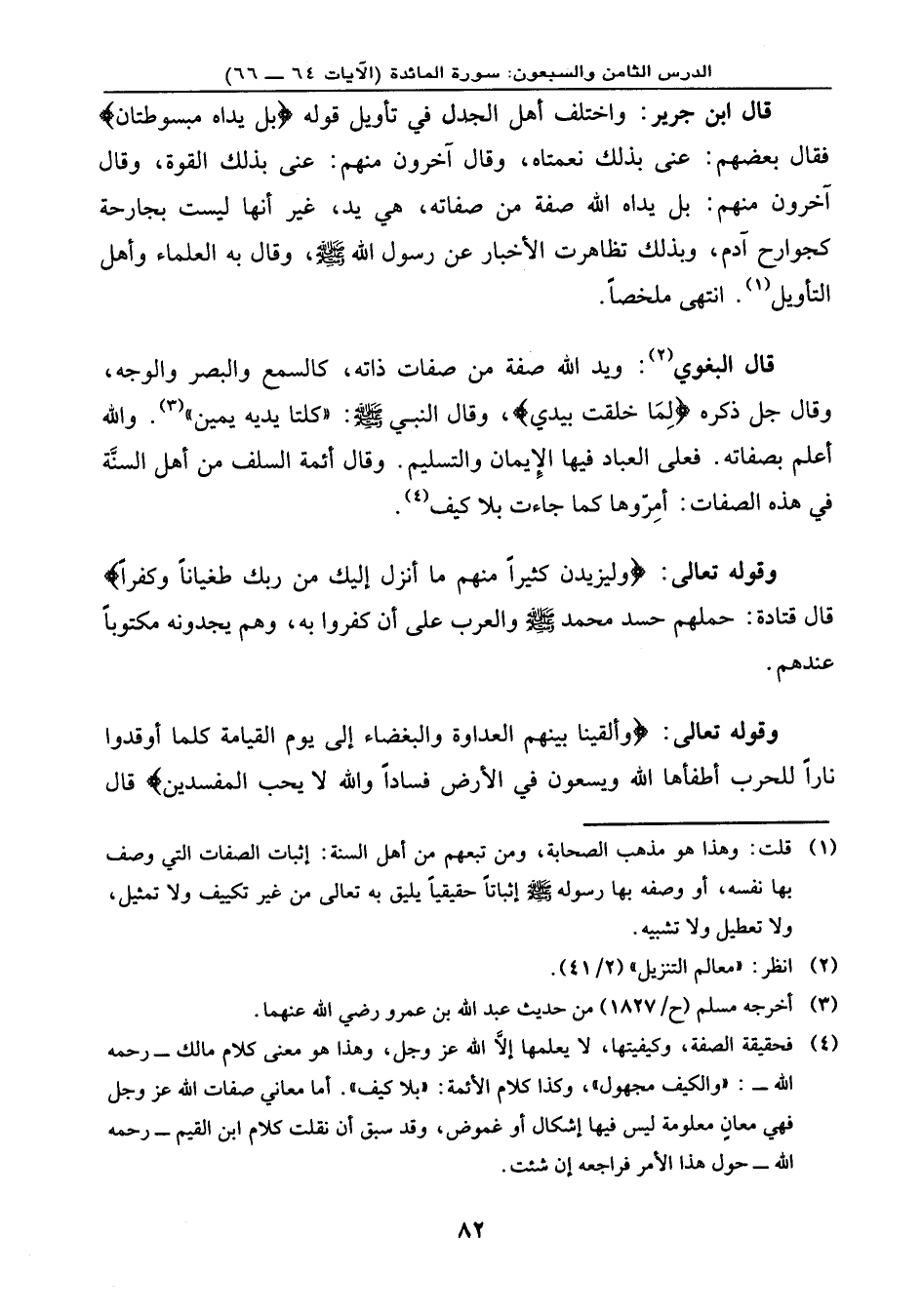 قال البغوي: ويد الله صفة من صفات ذاته، كالسمع والبصر والوجه، وقال جل ذكره: {لِمَا خَلَقْتُ بِيَدَيَّ} ، وقال النبي - صلى الله عليه وسلم -: «كلتا يديه يمين» . والله أعلم بصفاته. فعلى العباد فيها الإيمان والتسليم. وقال أئمة السلف من أهل السنَّة في هذه الصفات: أمِرُّوهَا كما جاءت بلا كيف.