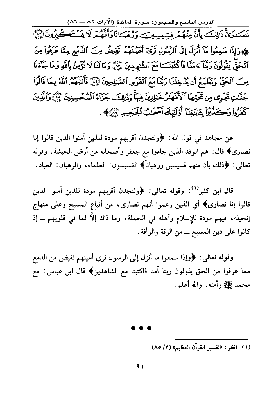 قال ابن كثير: وقوله تعالى: {وَلَتَجِدَنَّ أَقْرَبَهُمْ مَوَدَّةً لِلَّذِينَ آمَنُوا الَّذِينَ قَالُوا إِنَّا نَصَارَى} ، أي: الذين زعموا أنهم نصارى، من أتباع المسيح وعلى منهاج إنجيله، فيهم مودة للإسلام وأهله في الجملة، وما ذاك إلا لما في قلوبهم، - إذ كانوا على دين المسيح - من الرقة والرأفة.