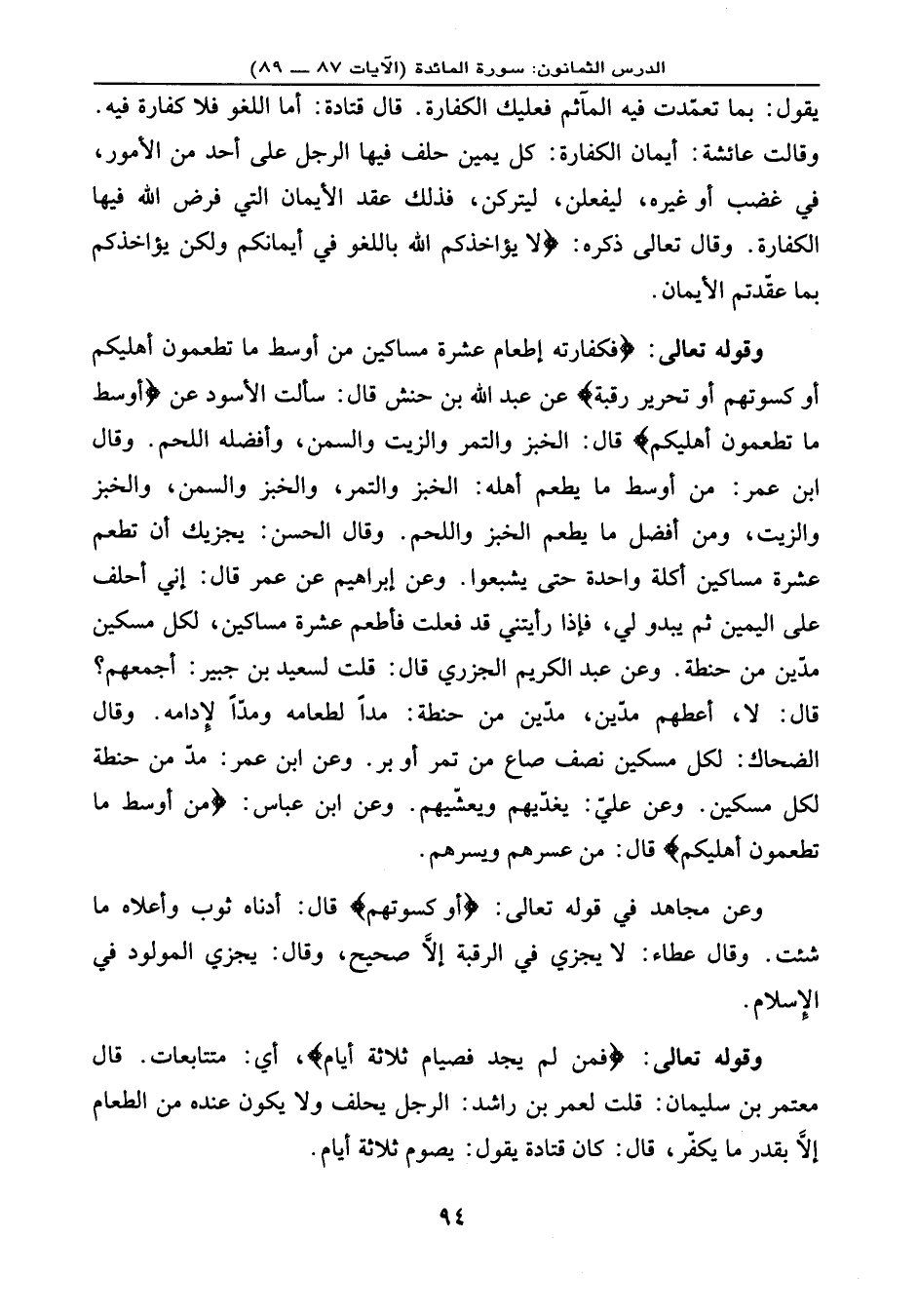 وقوله تعالى: {فَكَفَّارَتُهُ إِطْعَامُ عَشَرَةِ مَسَاكِينَ مِنْ أَوْسَطِ مَا تُطْعِمُونَ أَهْلِيكُمْ أَوْ كِسْوَتُهُمْ أَوْ تَحْرِيرُ رَقَبَةٍ} عن عبد الله بن حنش قال: سألت الأسود عن: {أَوْسَطِ مَا تُطْعِمُونَ أَهْلِيكُمْ} ، قال: الخبز، والتمر، والزيت، والسمن. وأفضله اللحم. وقال ابن عمر: من أوسط ما يطعم أهله: الخبز والتمر، والخبز والسمن، والخبز والزيت، ومن أفضل ما يطعم الخبز واللحم. وقال الحسن: يجزيك أن تطعم عشرة مساكين أكلة واحدة حتى يشبعوا. وعن إبراهيم عن عمر قال: إني أحلف على اليمين ثم يبدو لي، فإذا رأيتني قد فعلت فأطعم عشرة مساكين، لكل مسكين مدّين من حنطة. وعن عبد الكريم الجزري قال: قلت لسعيد بن جبير: أجمعهم؟ قال: لا، أعطهم مدّين، مدّين من حنطة مًدا لطعامه، ومدًّا لإِدامه من حنطة لكل مسكين. وعن عليّ: يغدّيهم ويعشّيهم. وعن ابن عباس: {مِنْ أَوْسَطِ مَا تُطْعِمُونَ أَهْلِيكُمْ} ، قال: من عسرهم ويسرهم.