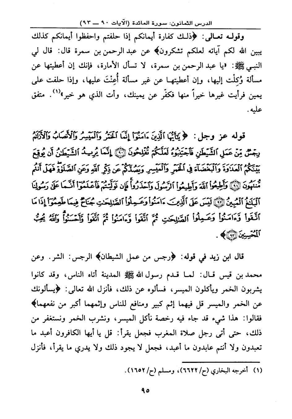 وقوله تعالى: {ذَلِكَ كَفَّارَةُ أَيْمَانِكُمْ إِذَا حَلَفْتُمْ وَاحْفَظُواْ أَيْمَانَكُمْ كَذَلِكَ يُبَيِّنُ اللهُ لَكُمْ آيَاتِهِ لَعَلَّكُمْ تَشْكُرُونَ} ، عن عبد الرحمن بن سمرة قال: قال لي النبي - صلى الله عليه وسلم -: «يا عبد الرحمن بن سمرة، لا تسأل الإمارة، فإنك إن أعطيتها عن مسألة وُكِلْت إليها، وإن أعطيتها عن غير مسألة أُعِنْتَ عليها، وإذا حلفت على يمين فرأيت غيرها خيرًا منها فكفّر عن يمينك، وأت الذي هو خير» . متفق عليه.