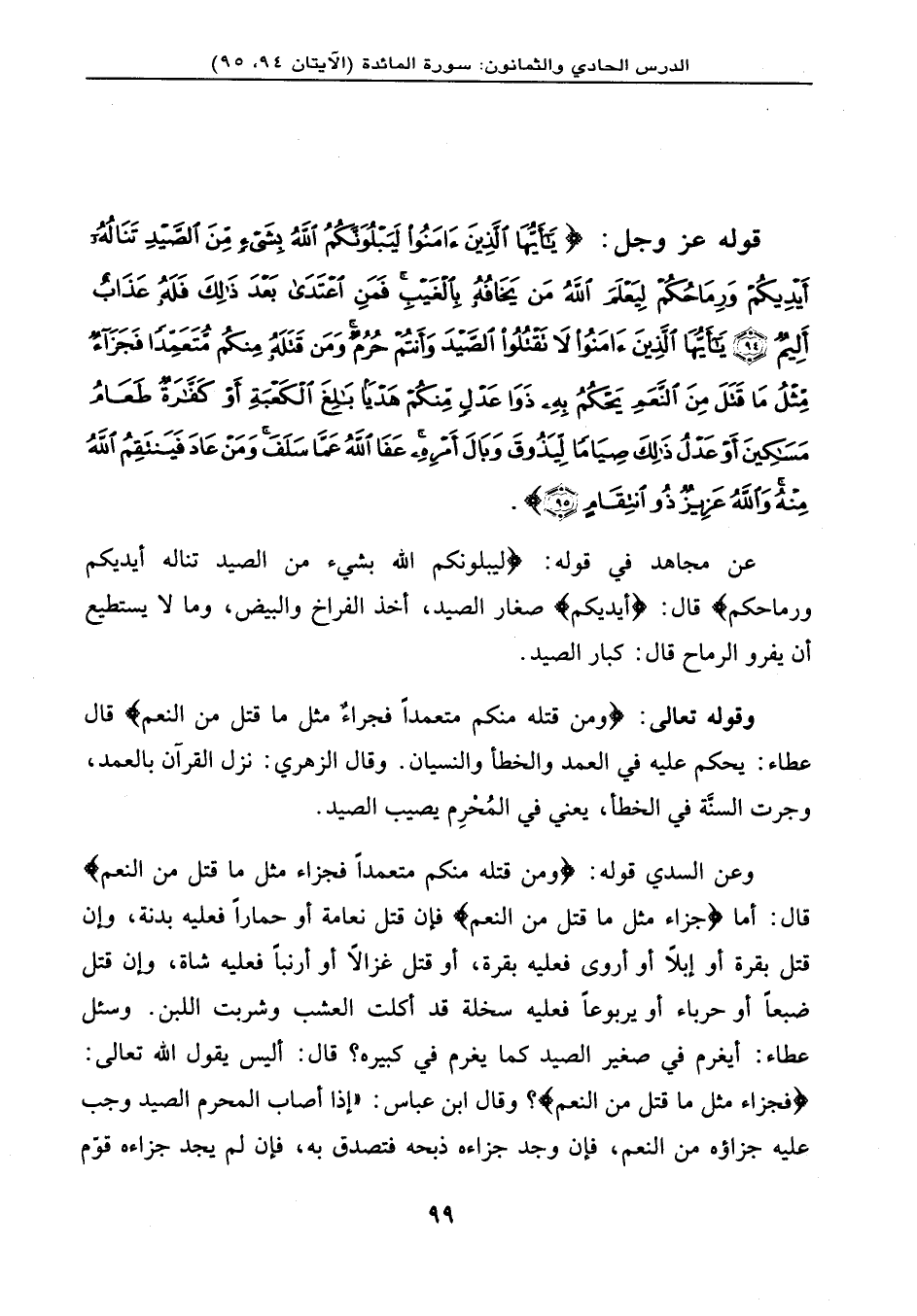 وعن السدي قوله: {وَمَن قَتَلَهُ مِنكُم مُّتَعَمِّداً فَجَزَاء مِّثْلُ مَا قَتَلَ مِنَ النَّعَمِ} ، قال: أما جزاء مثل ما قتل من النعم فإن قتل نعامة أو حمارًا فعليه بدنة، وإن قتل بقرة أو إبلاً أو أروى فعليه بقرة، أو قتل غزالاً أو أرنبًا فعليه شاة، وإن قتل ضبعًا أو حرباء أو يربوعًا فعليه سخلة قد أكلت العشب وشربت اللبن. وسئل عطاء: أيغرم في صغير الصيد كما يغرم في كبيره؟