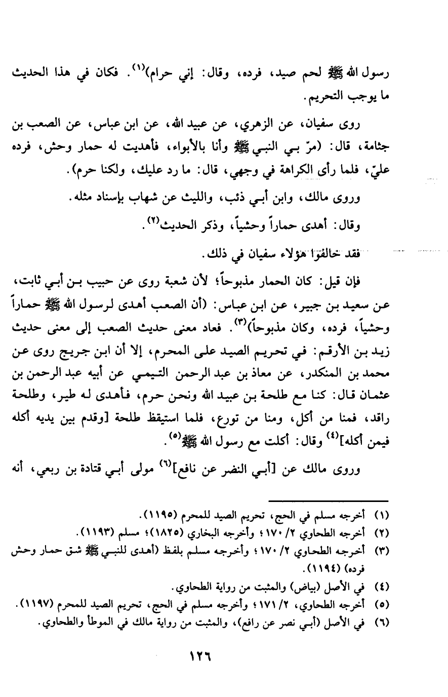 فَإِن قيل كَانَ الْحمار مذبوحا لِأَن شُعْبَة روى عَن حبيب بن أبي ثَابت عَن سعيد بن جُبَير عَن ابْن عَبَّاس أَن الصعب أهْدى لرَسُول الله صلى الله عَلَيْهِ وَسلم حمارا وحشيا فَرده وَكَانَ مذبوحا فَعَاد معنى حَدِيث الصعب إِلَى معنى حَدِيث 3 زيد بن الأرقم فِي تَحْرِيم الصَّيْد على الْمحرم إِلَّا أَن ابْن جريج روى عَن مُحَمَّد بن الْمُنْكَدر عَن معَاذ بن عبد الرَّحْمَن التَّيْمِيّ عَن أَبِيه عبد الرَّحْمَن بن عُثْمَان قَالَ كُنَّا مَعَ طَلْحَة بن عبيد الله وَنحن حرم فأهدى لَهُ طير وَطَلْحَة رَاقِد فمنا من أكل وَمنا من تورع فَلَمَّا اسْتَيْقَظَ طَلْحَة وَقدم بَين يَدَيْهِ أكله فِيمَن أكله وَقَالَ أكلت مَعَ رَسُول الله صلى الله عَلَيْهِ وَسلم