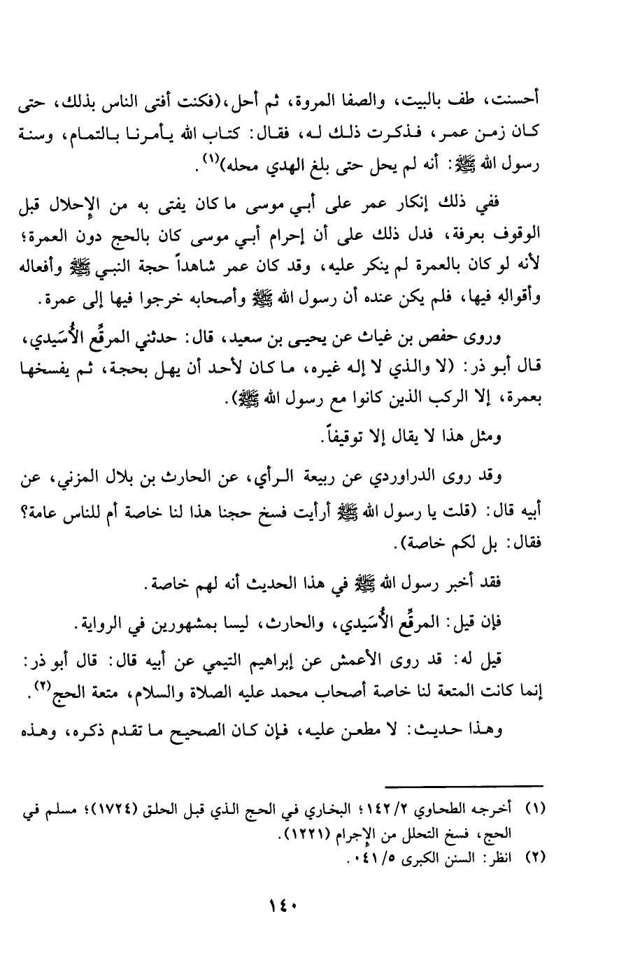 فَفِي ذَلِك إِنْكَار عمر على أبي مُوسَى مَا كَانَ يُفْتِي بِهِ من الْإِحْلَال قبل الْوُقُوف بِعَرَفَة فَدلَّ ذَلِك على أَن إِحْرَام أبي مُوسَى كَانَ بِالْحَجِّ دون الْعمرَة لِأَنَّهُ لَو كَانَ بِالْعُمْرَةِ لم يُنكر عَلَيْهِ وَقد كَانَ عمر شَاهدا حجَّة النَّبِي صلى الله عَلَيْهِ وَسلم وأفعاله وأقواله فِيهَا فَلم يكن عِنْده أَن رَسُول الله صلى الله عَلَيْهِ وَسلم وَأَصْحَابه خَرجُوا فِيهَا إِلَى عمْرَة