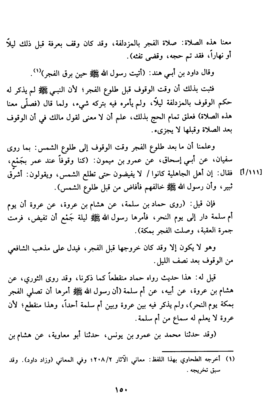 قيل لَهُ هَذَا حَدِيث رَوَاهُ حَمَّاد مُنْقَطِعًا كَمَا ذكرنَا وَقد روى الثَّوْريّ عَن هِشَام بن عُرْوَة عَن أَبِيه عَن أم سَلمَة أَن رَسُول الله صلى الله عَلَيْهِ وَسلم أمرهَا أَن تصلي الْفجْر بِمَكَّة يَوْم النَّحْر وَلم يذكر فِيهِ بَين عُرْوَة وَبَين أم سَلمَة أحدا وَهَذَا مُنْقَطع لِأَن عُرْوَة لَا يعلم لَهُ سَماع من أم سَلمَة