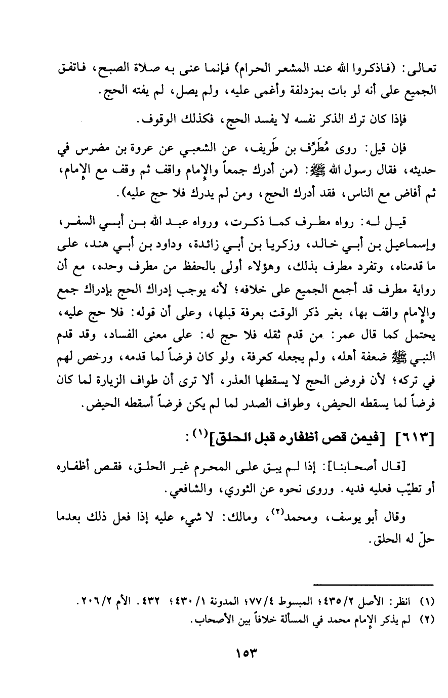 قيل لَهُ رَوَاهُ مطرف كَمَا ذكرت وَرَوَاهُ عبد الله بن أبي السّفر وَإِسْمَاعِيل بن أبي خَالِد وزَكَرِيا بن أبي زَائِدَة وَدَاوُد بن أبي هِنْد على مَا قدمْنَاهُ وَتفرد مطرف بذلك وَهَؤُلَاء أولى بِالْحِفْظِ من مطرف وَحده مَعَ أَن رِوَايَة مطرف قد أجمع الْجَمِيع على خِلَافه لِأَنَّهُ يُوجب إِدْرَاك الْحَج بِإِدْرَاك جمع وَالْإِمَام وَاقِف بهَا بِغَيْر ذكر الْوَقْت بِعَرَفَة قبلهَا وعَلى أَن قَوْله فَلَا حج عَلَيْهِ يحْتَمل كَمَا قَالَ عمر من قدم ثقله فَلَا حج لَهُ على معنى الْفساد وَقد قدم النَّبِي صلى الله عَلَيْهِ وَسلم ضعفة أَهله وَلم يَجعله كعرفة وَلَو كَانَ فرضا لما قدمه وَرخّص لَهُم فِي تَركه لِأَن فروض الْحَج لَا يُسْقِطهَا الْعذر أَلا ترى أَن طواف الزِّيَارَة لما كَانَ فرضا لما يسْقطهُ الْحيض وَطواف الصَّدْر لما لم يكن فرضا أسْقطه الْحيض