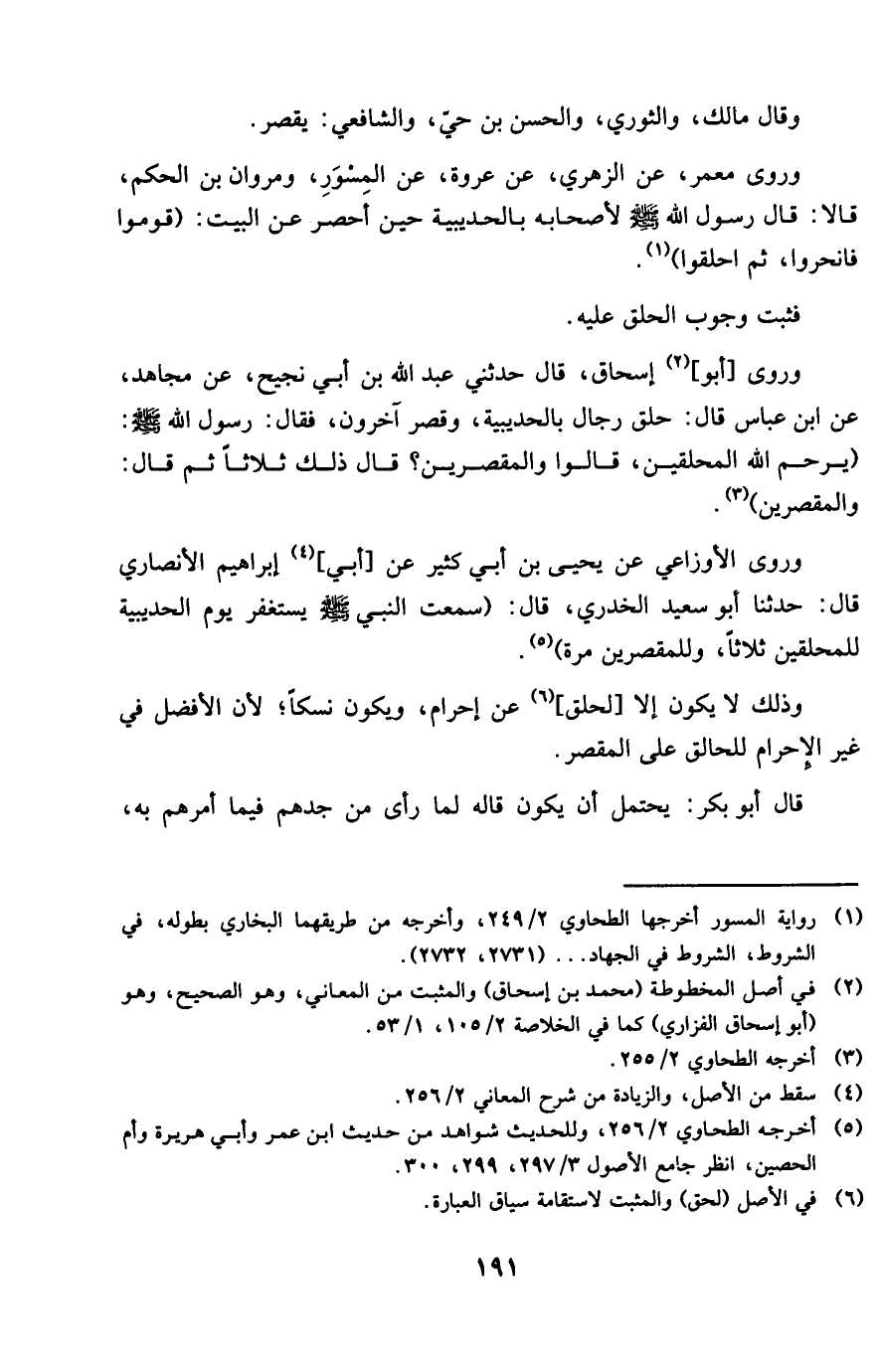وروى أَبُو إِسْحَاق قَالَ حَدثنِي عبد الله بن أبي نجيح عَن مُجَاهِد عَن ابْن عَبَّاس قَالَ حلق رجال بِالْحُدَيْبِية وَقصر آخَرُونَ فَقَالَ رَسُول الله صلى الله عَلَيْهِ وَسلم يرحم الله المحلقين قَالُوا والمقصرين قَالَ ذَلِك ثَلَاثًا ثمَّ قَالَ والمقصرين