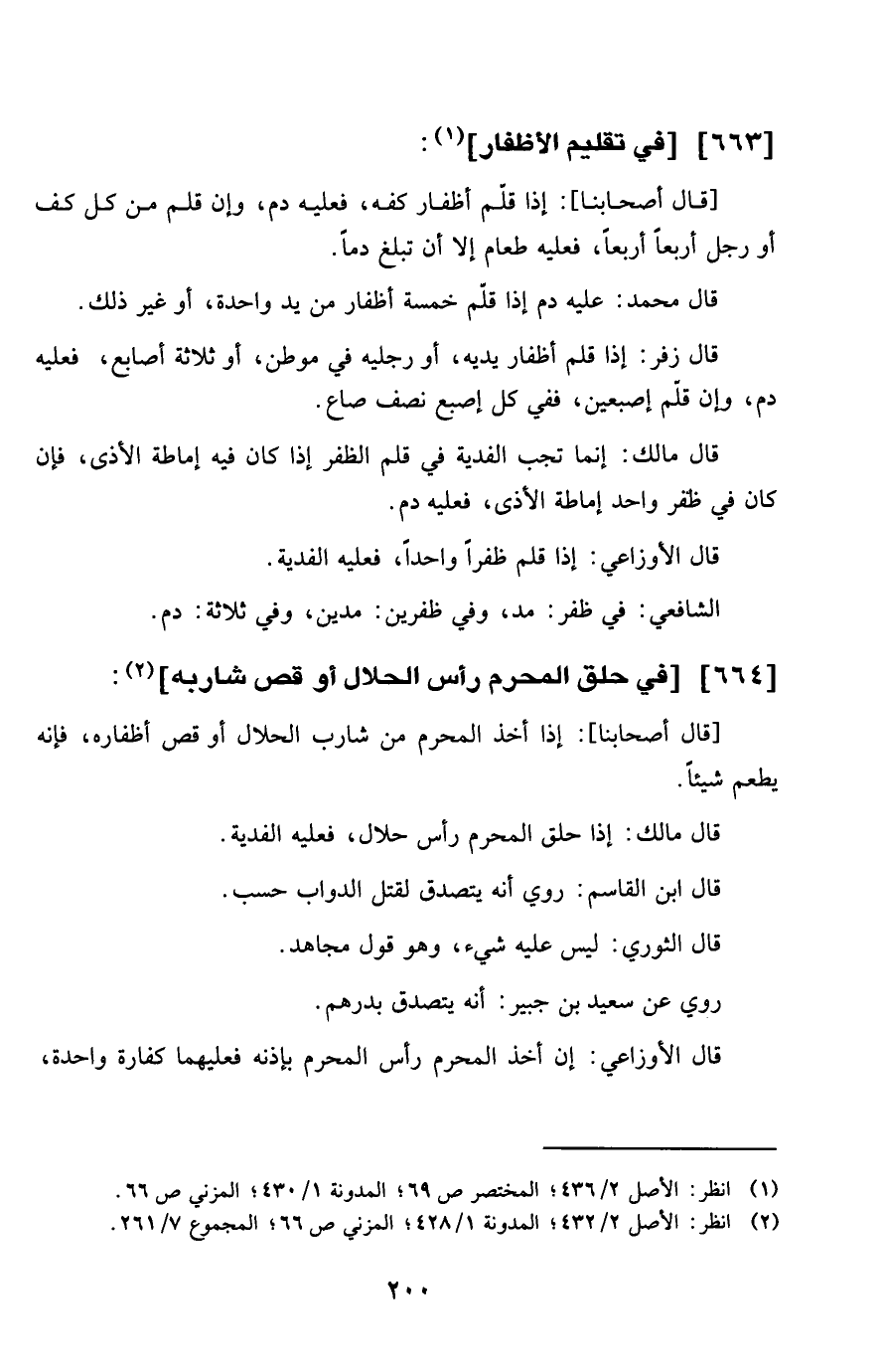 قَالَ أصحابناإذاقلم أظفار كَفه فَعَلَيهِ دم وَإِن قلم من كل كف أَو رجل أَرْبعا أَرْبعا فَعَلَيهِ طَعَام إِلَّا أَن تبلغ دَمًا